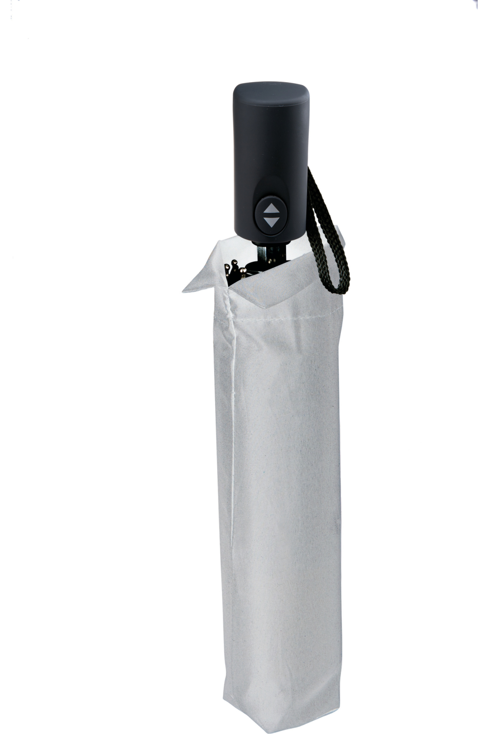 Mini parapluie 21" (diamètre : 96 cm) pliable en 3 parties, ouverture et fermeture automatique, mât en métal, baleines en aluminium/fibres de verre, poignée en gomme, toile 100% pongé de polyester, embouts de baleine en métal.
