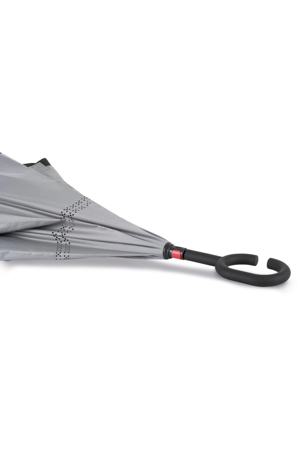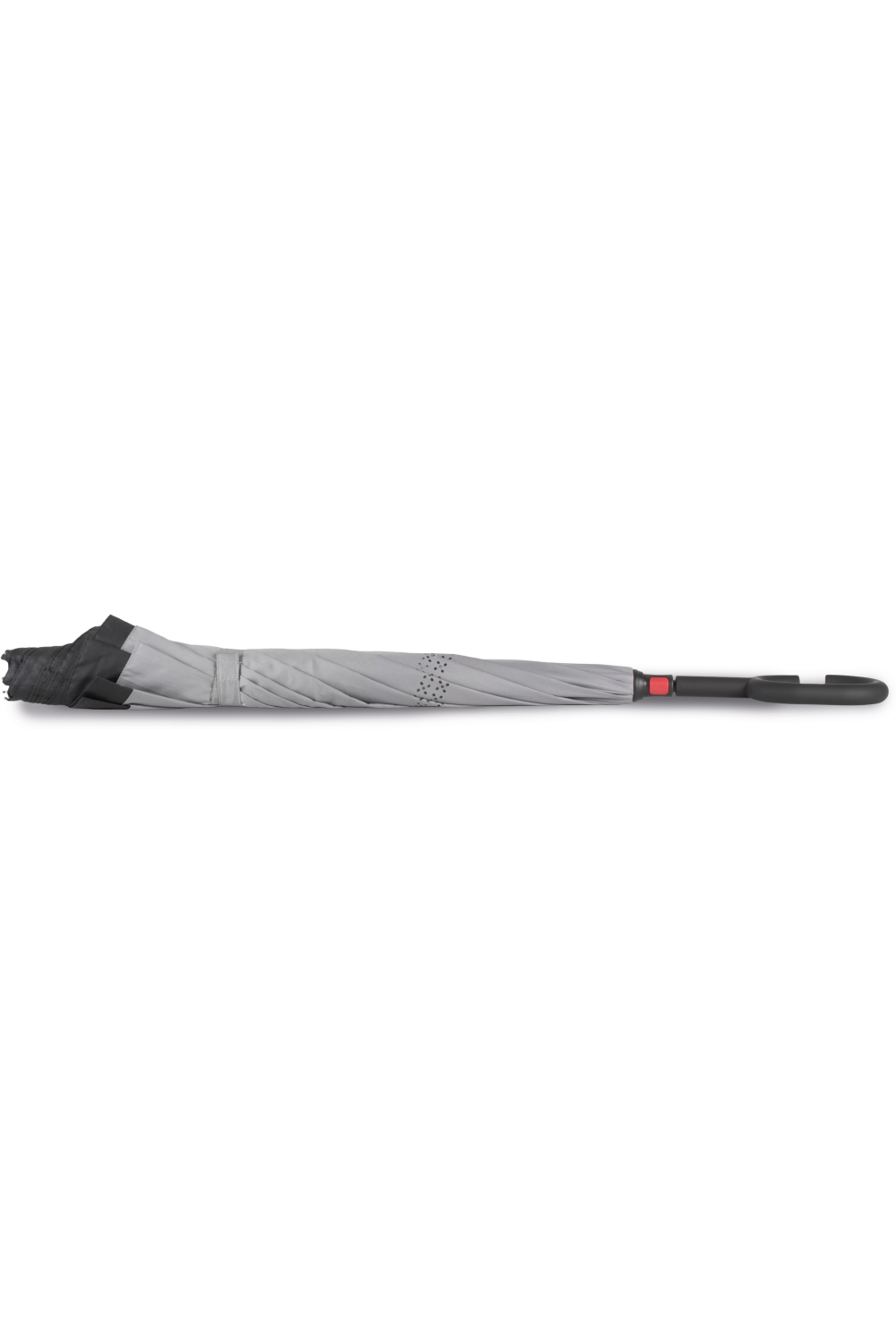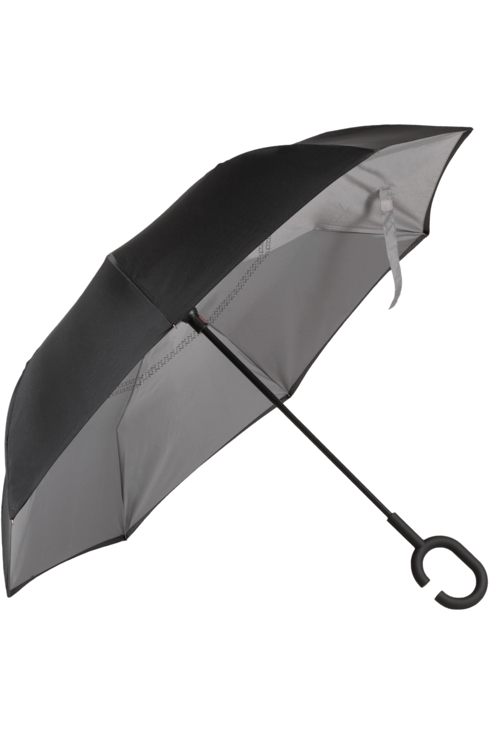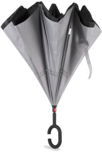 Parapluie avec système d'ouverture manuelle inversé 23' (diamètre : 108 cm), mât en métal, baleines et embouts de baleines en fibres de verre, poignée mains libres en polycarbonate en forme de C pour accroche au poignet. Toile en pongé de polyester 190T.