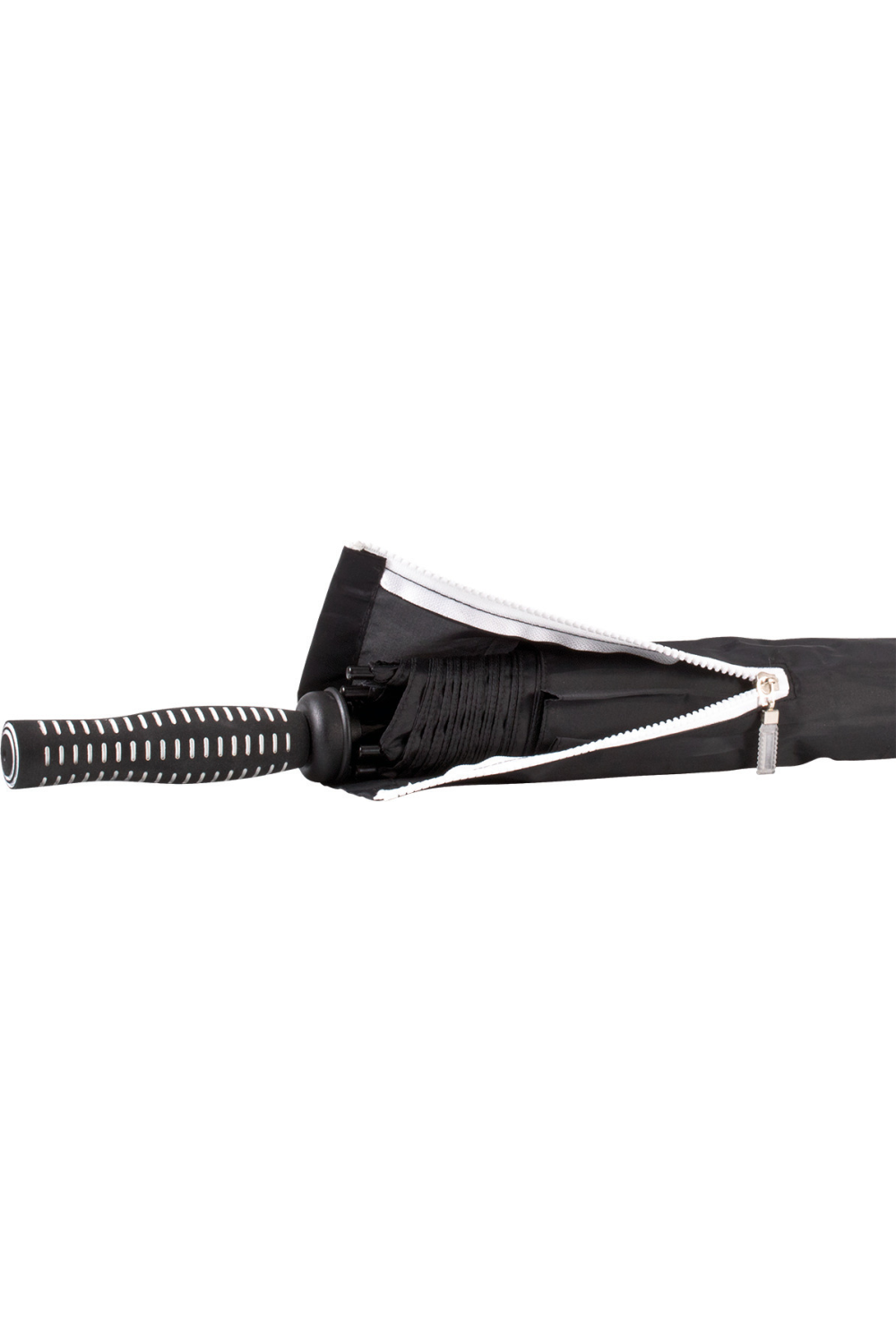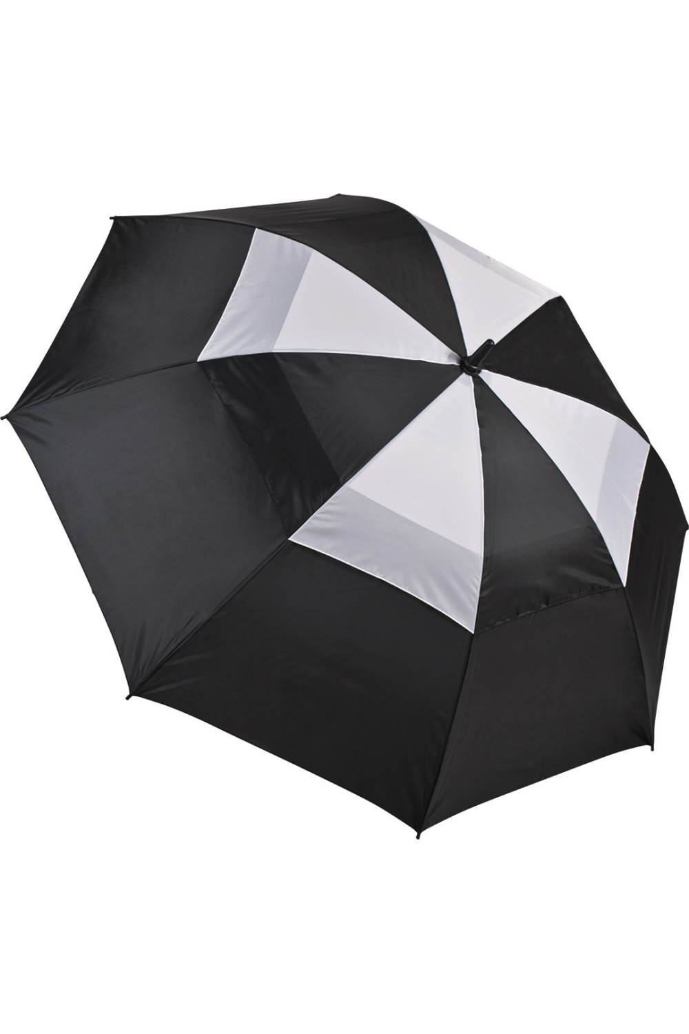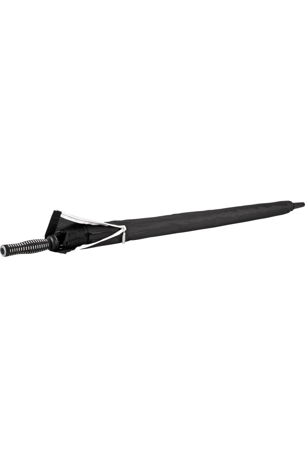 Parapluie de golf 29,5 " (diamètre : 130 cm), ouverture manuelle avec curseur de sécurité. Mât et baleines en fibres de verre, embouts de baleine en polypropylène. Toile en polyester 210T avec double voilure bicolore anti rafale sur le haut. Poignée ergonomique et antidérapante. Housse zippée de couleur contrastée.