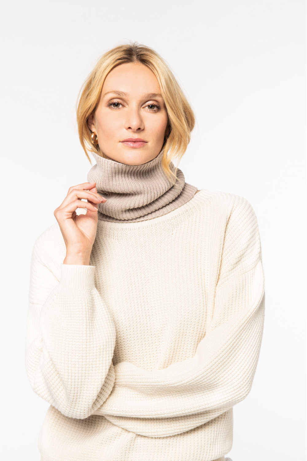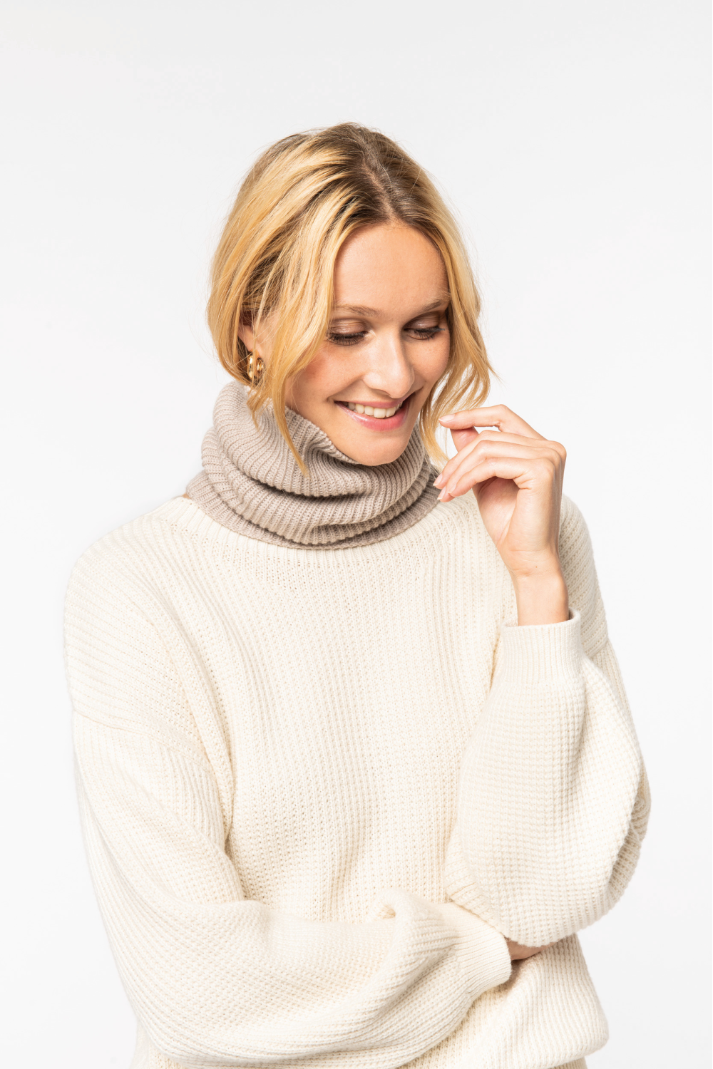 100% laine Mérinos responsable. *Responsible Wool Standard. Fabrication Espagne. Jauge 10. Tricotage en côte 1 x 1. Fil peigné. Matière douce et chaude.