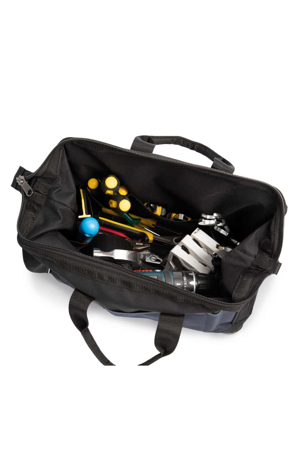 100% polyester. Sac à outils en polyester avec fond plastique. Grande ouverture unique en haut pour faciliter la recherche des outils. Sangles latérales pour assurer la solidité de la structure même avec un poids relatif et pour accueillir le niveau à bulle. Bandoulière réglable.