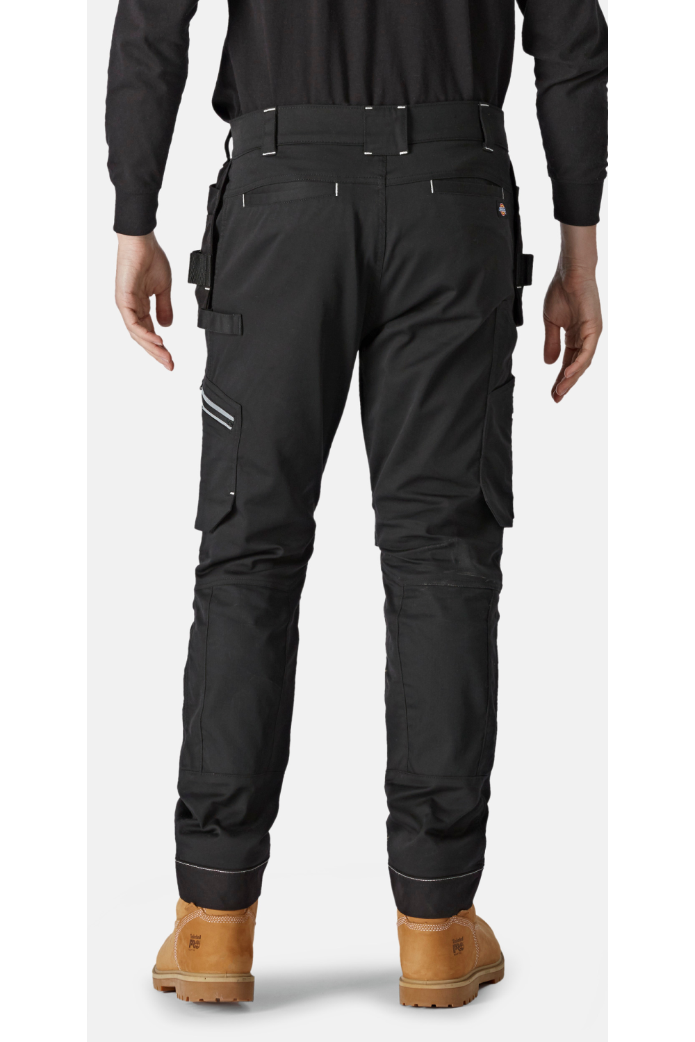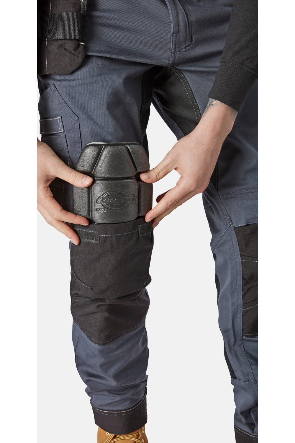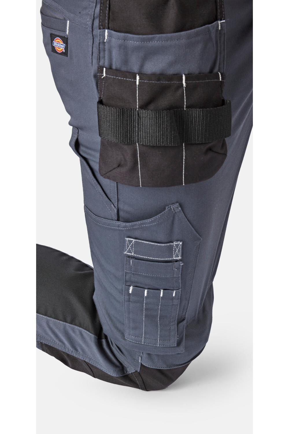 60% coton / 38% polyester / 2% élasthanne. Multi poche. Poches Holster. Renforts genoux. Taille élastiquée. Passant pour marteau. Poche pour règle. Bandes réfléchissantes.