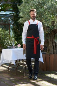 65% Polyester / 35% Coton. Tablier équipé de 4 œillets. 2 œillets à l'avant et 2 à l'arrière au niveau de la taille. Coupe ajustée. Attache interchangeable avec boutons à pression. Se croise dans le dos et se noue à l'avant. Vendu sans l'attache (référence CI02). Fabriqué en Allemagne. Certifié STANDARD 100 by OEKO-TEX®N° 512-0301, HOHENSTEIN HTTI.