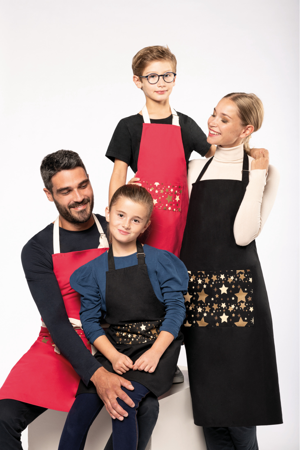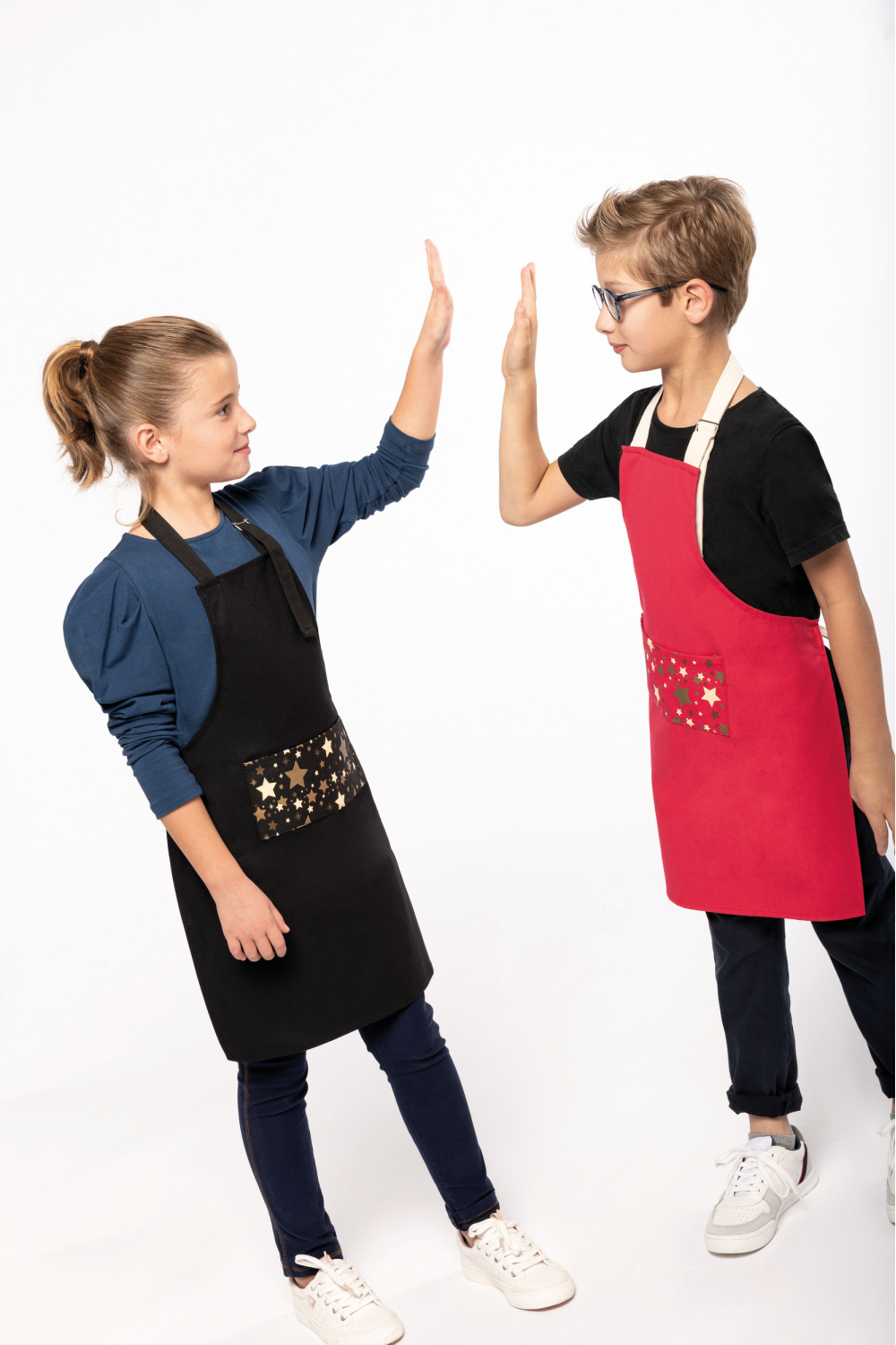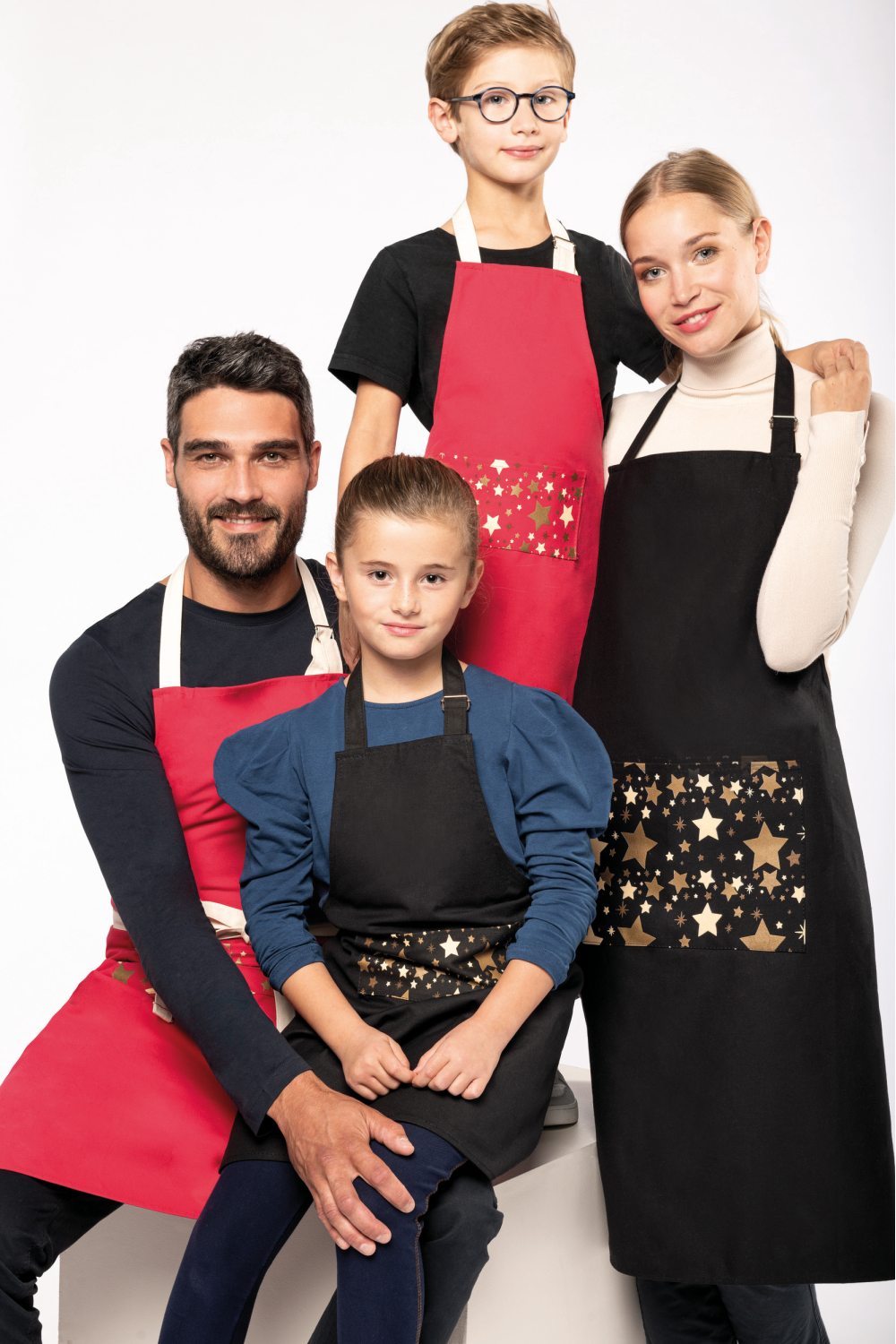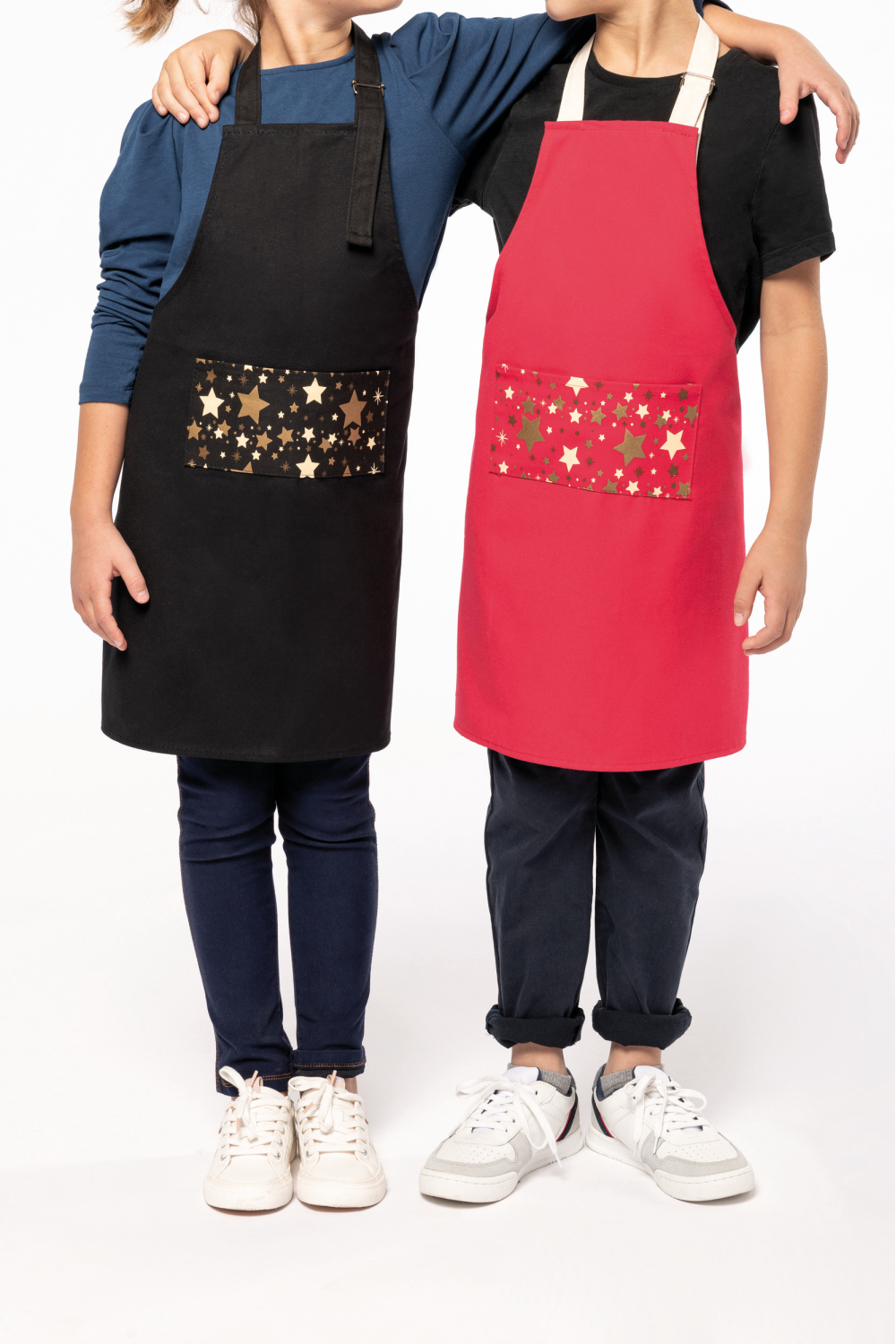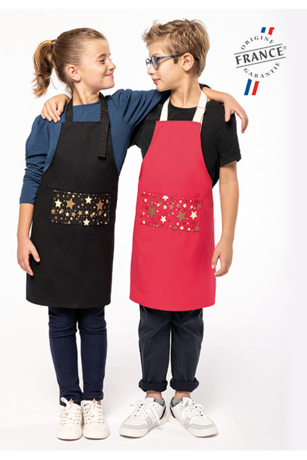100% coton. Lavage domestique 60°C. Boucle de réglage en métal au niveau du cou pour ajuster la longueur du tablier. Grande poche avec motifs étoiles sérigraphiés à l'avant. Lanières réglage col et taille contrastées en natural sur coloris rouge et ton sur ton sur coloris noir. Étiquette autocollante détachable "Origine France garantie. Produit en Bretagne" devant. Label OFG (Origine France Garantie). Dimensions : H 60 cm x L 48 cm. Poche : H 10 cm x L 20 cm.