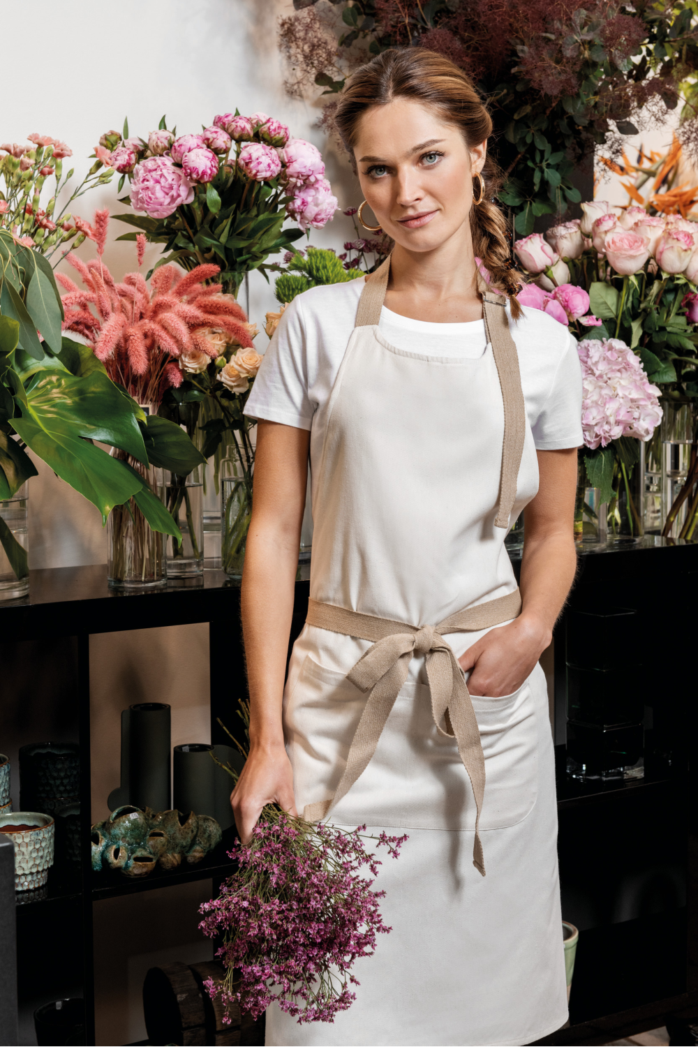 Coloris Hemp et Rosewood : 73% coton recyclé pré-consumer /27% polyester recyclé post-consumer. Coloris Carbon et Ecume : 73% coton recyclé pré-consumer / 25% polyester recyclé post-consumer /2% autres fibres. Coloris Meadow Green : 65% coton recyclé pré-consumer / 35% polyester recyclé post-consumer. Lavage domestique 60°C. Boucle de réglage en métal au niveau du cou pour ajuster la longueur du tablier. Grande poche avant en deux compartiments. Sangle taille et encolure en coton recyclé, coloris Hemp pour toutes les couleurs. Dimensions : H 90 cm x L 76 cm. Poche : H 20 cm x L 31,5 cm. Issu d’un processus de recyclage, le tissu peut présenter de légères variations de couleur, rendant chaque pièce unique.