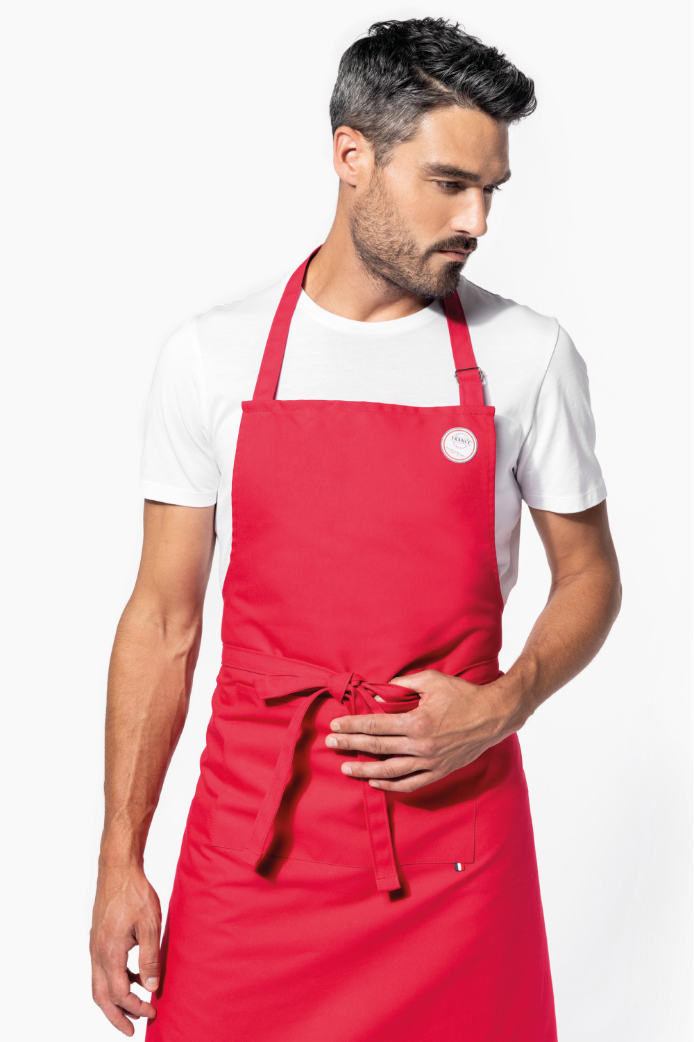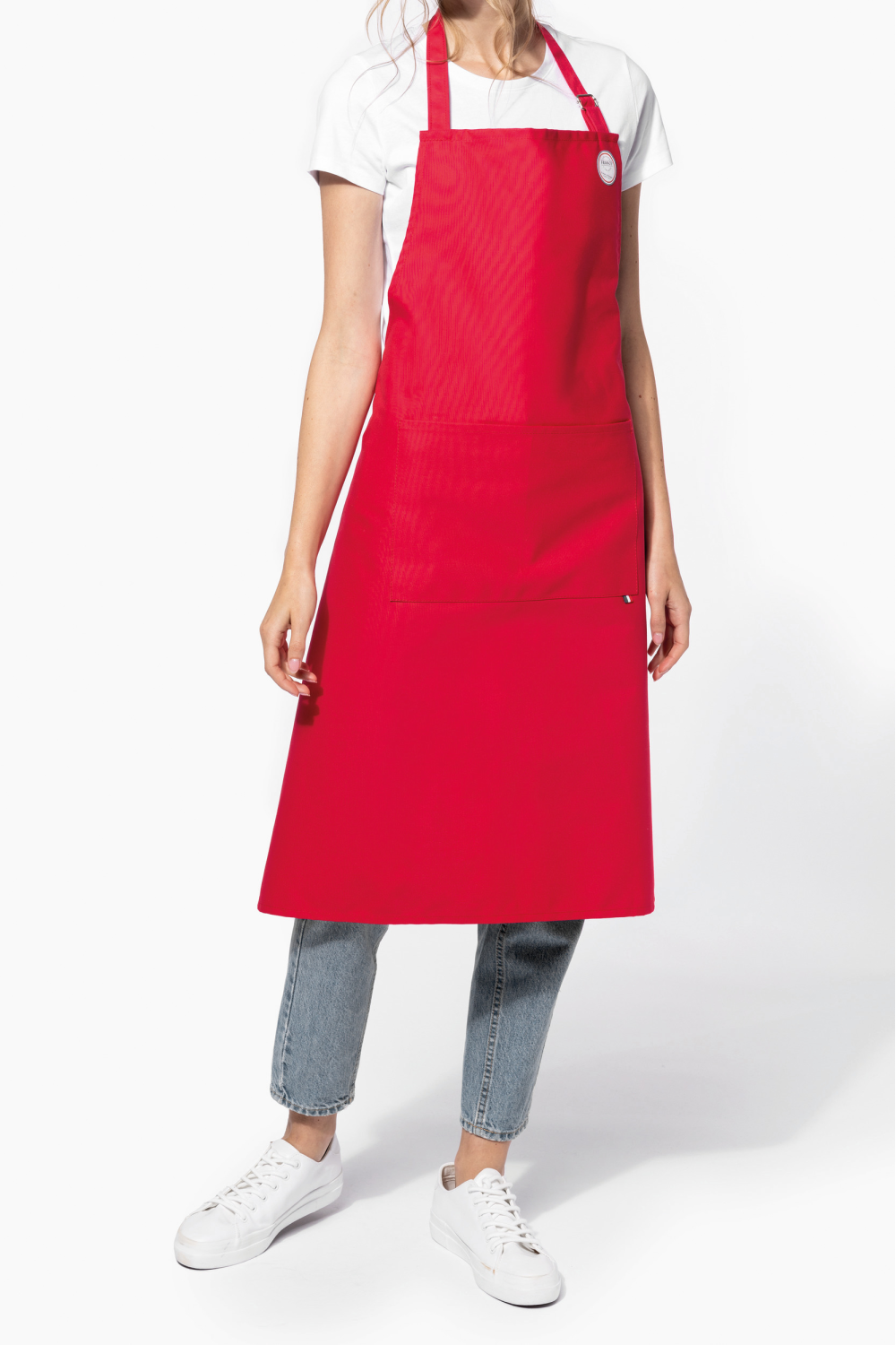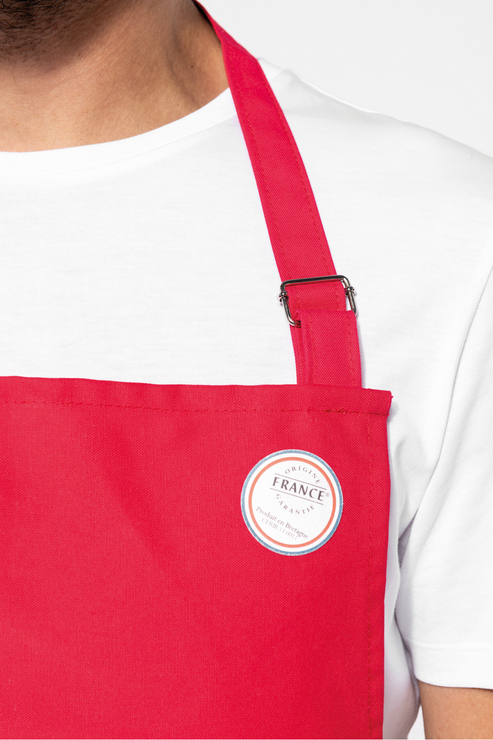 100% coton. Lavage domestique à 60°C. Longueur ajustable pour un meilleur confort. Étiquette tissée drapeau France sur poche avant. Label "Origine France Garantie. Fabriqué en Bretagne"