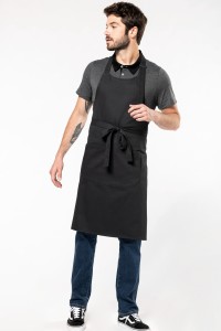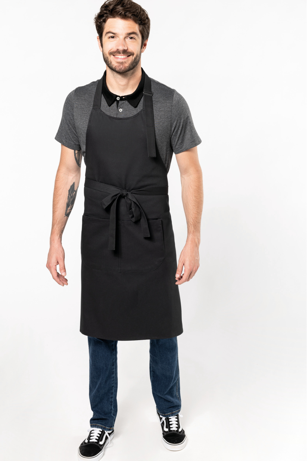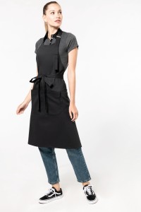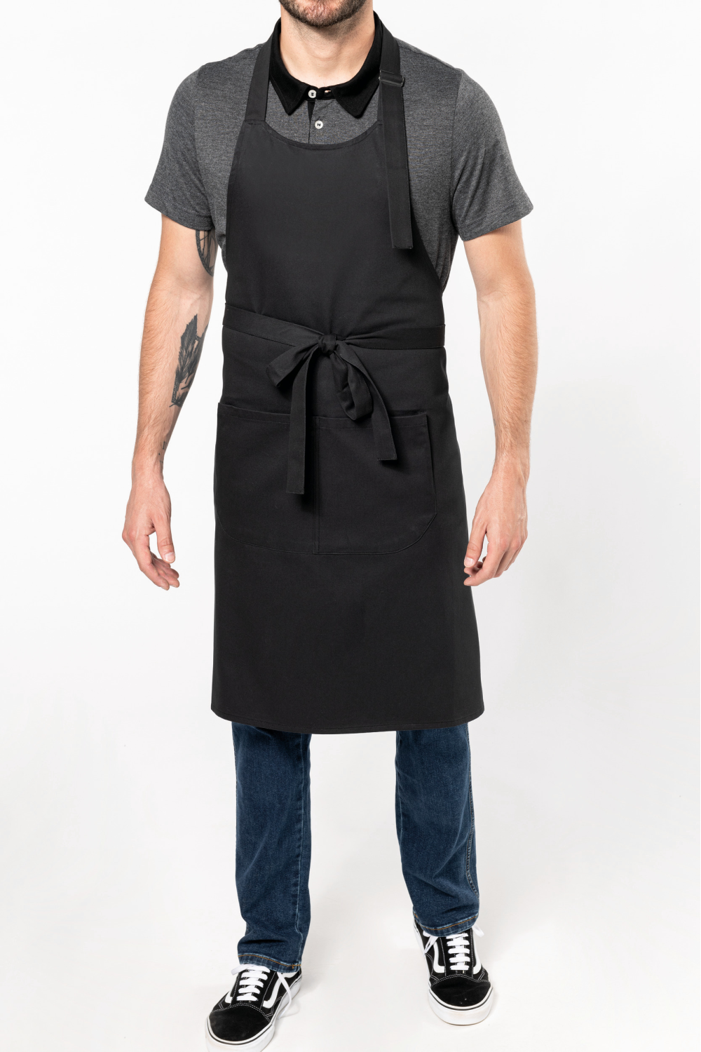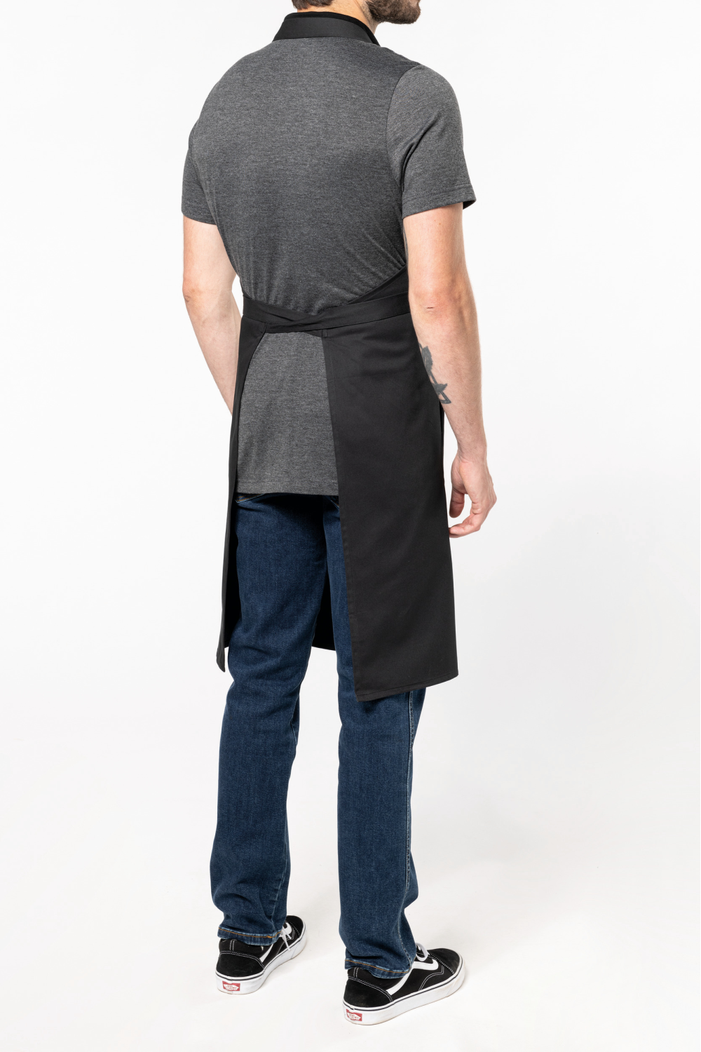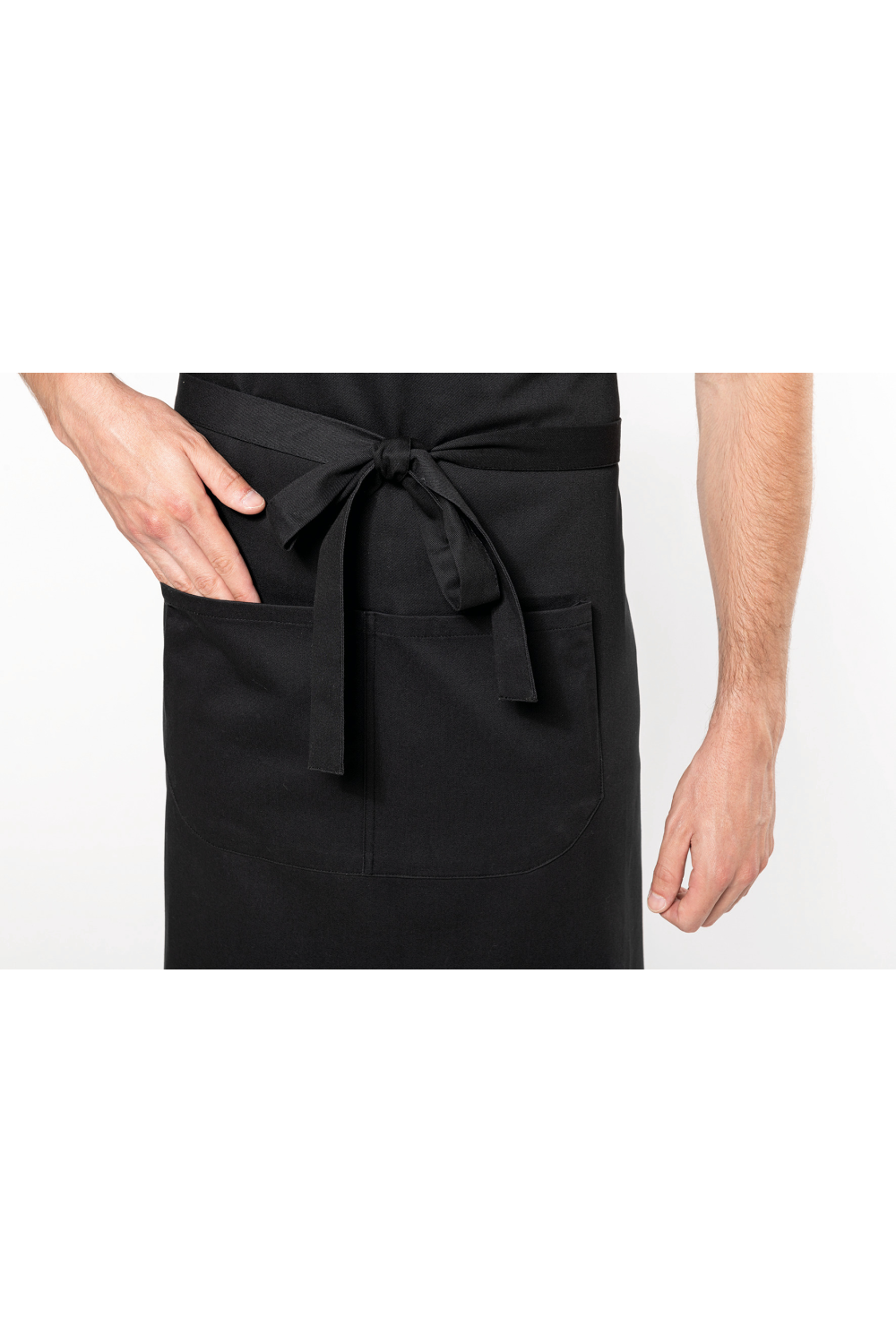100% coton. Lavage domestique 60°C. Lavage industriel 85°C conforme aux éxigences de la norme ISO15797. Boucle de réglage en métal au niveau du cou pour ajuster la longueur du tablier. Grande poche avant en deux compartiments. Dimensions : H 90 cm - L 76 cm. Poche : H 20 cm - L 31,5 cm. Certifié STANDARD 100 by OEKO-TEX® N° CQ 1007/8, IFTH.