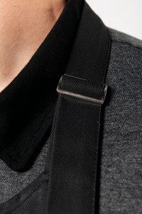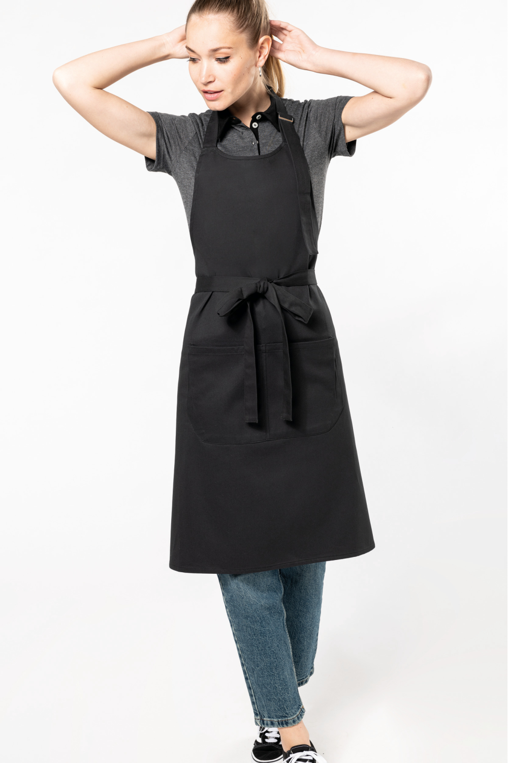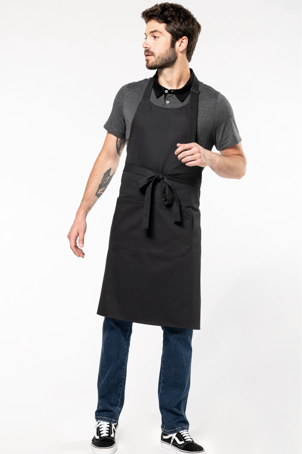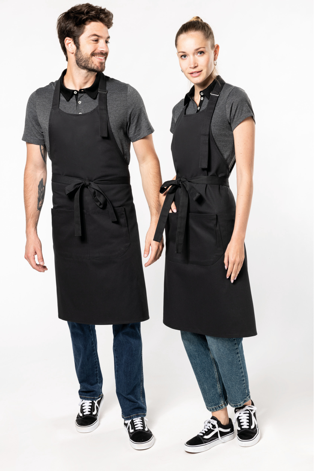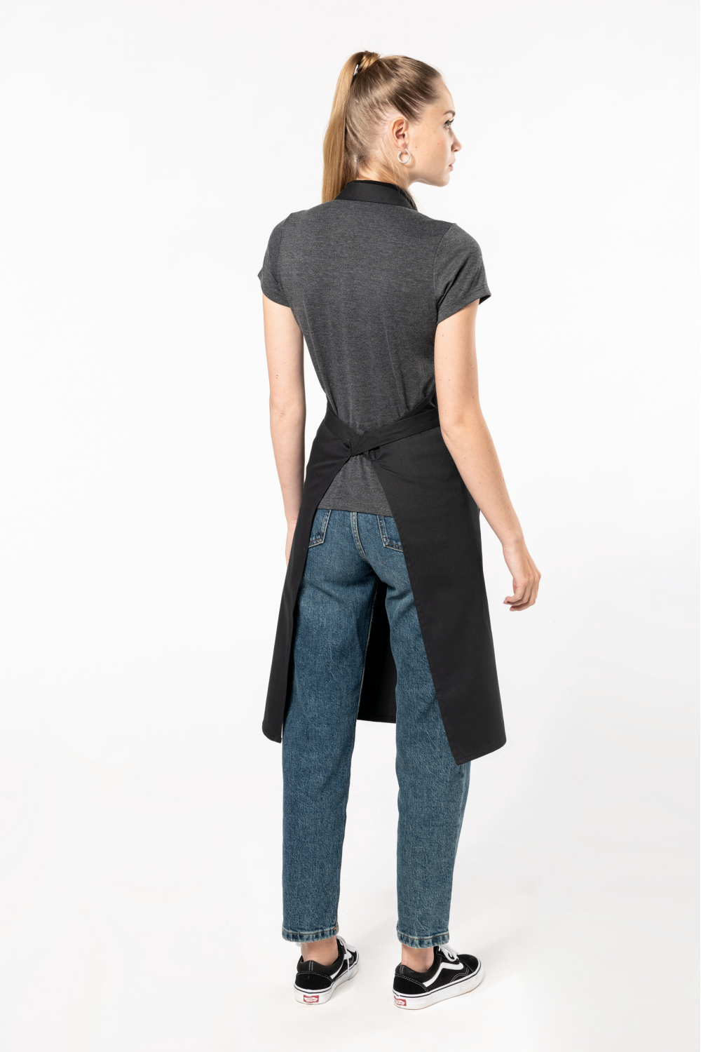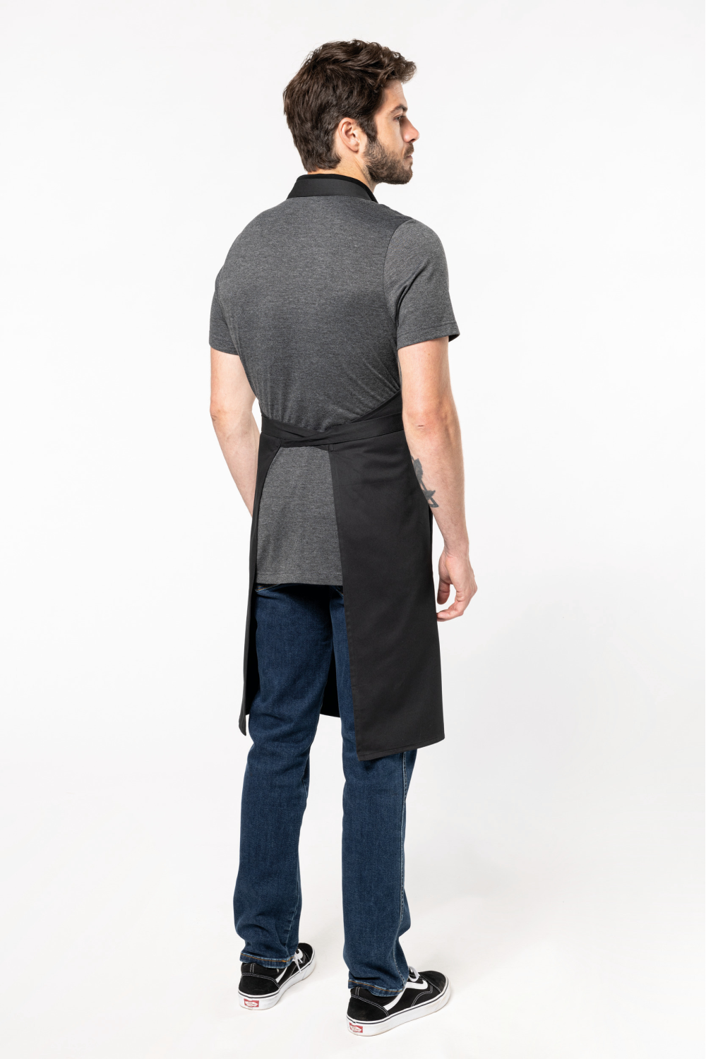 100% coton. Lavage domestique 60°C. Lavage industriel 85°C conforme aux éxigences de la norme ISO15797. Boucle de réglage en métal au niveau du cou pour ajuster la longueur du tablier. Grande poche avant en deux compartiments. Dimensions : H 90 cm - L 76 cm. Poche : H 20 cm - L 31,5 cm. Certifié STANDARD 100 by OEKO-TEX® N° CQ 1007/8, IFTH.