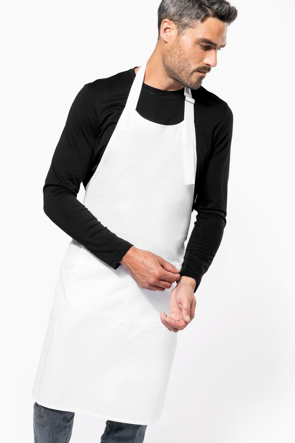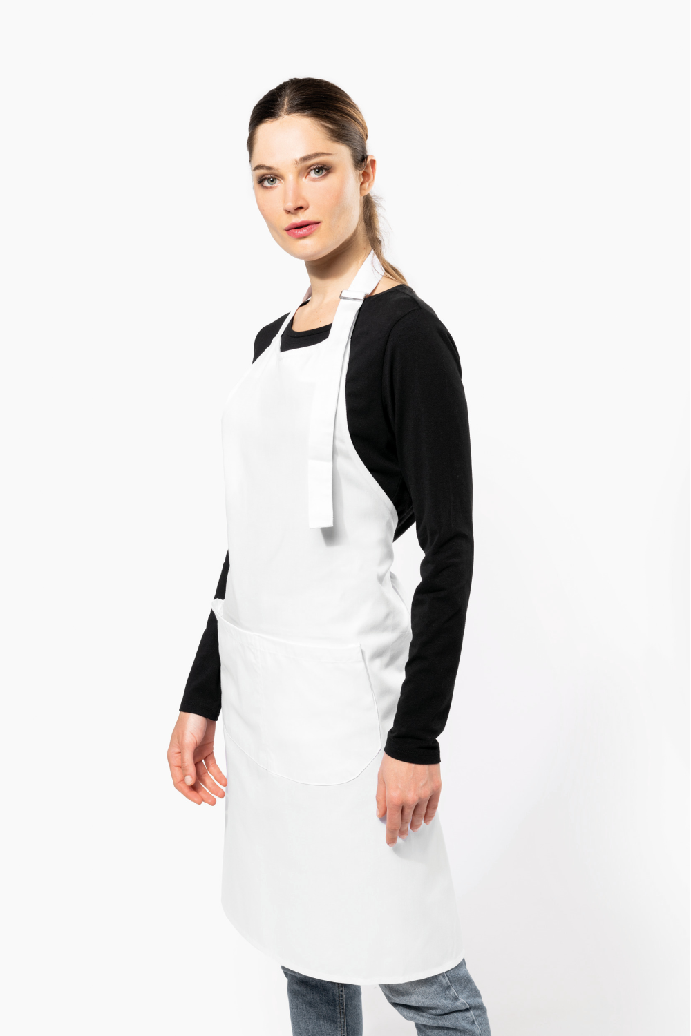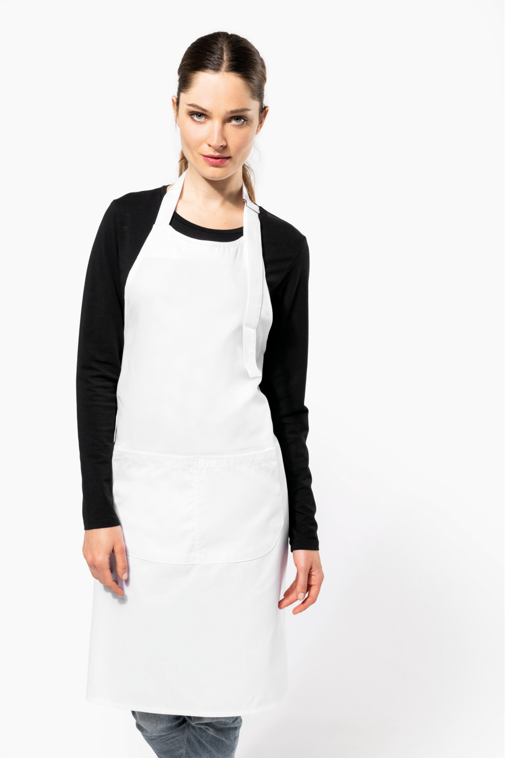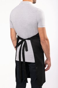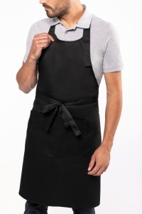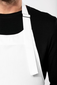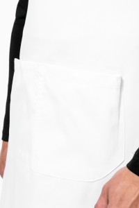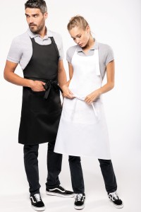 65% polyester / 35% coton. Lavage domestique 60°C. Lavage industriel 85°C conforme aux éxigences de la norme ISO15797. Boucle de réglage en métal au niveau du cou pour ajuster la longueur du tablier. Grande poche avant en deux compartiments. Dimensions : H 90 cm - L 76 cm. Poche : H 20 cm - L 31,5 cm. Certifié STANDARD 100 by OEKO-TEX® N° CQ 1007/8, IFTH.