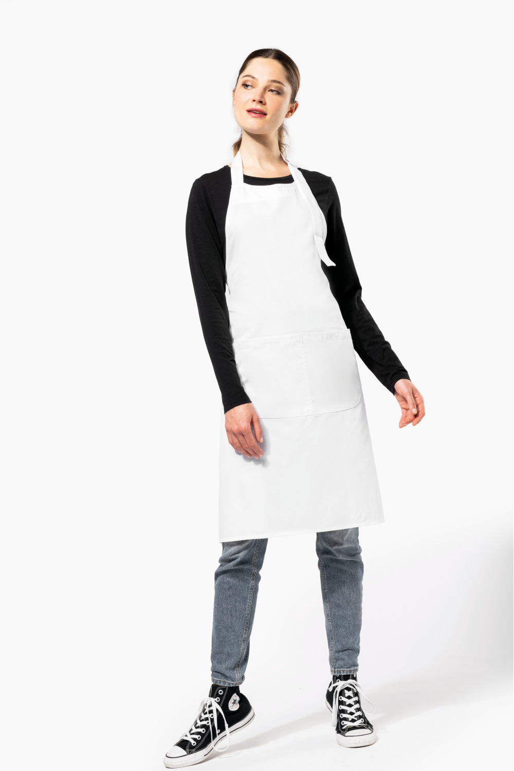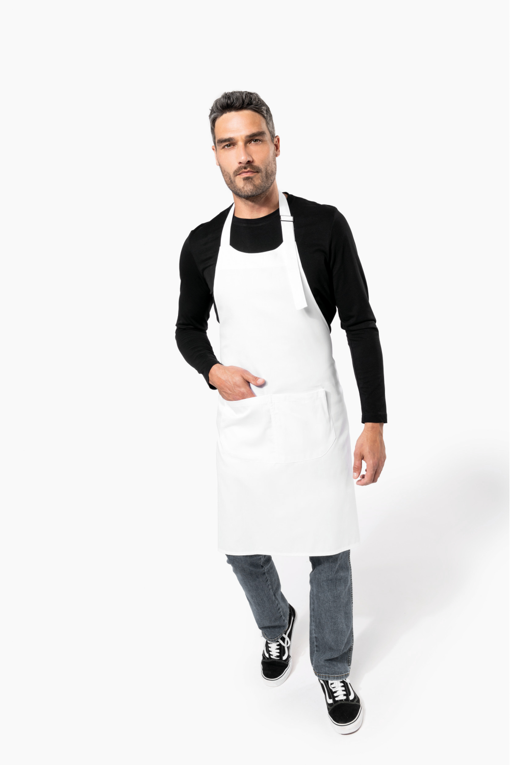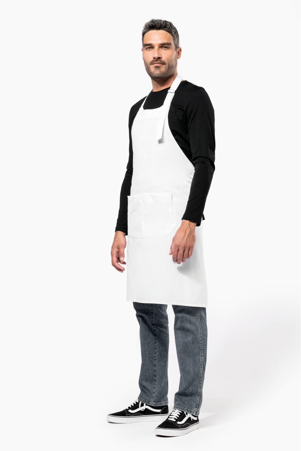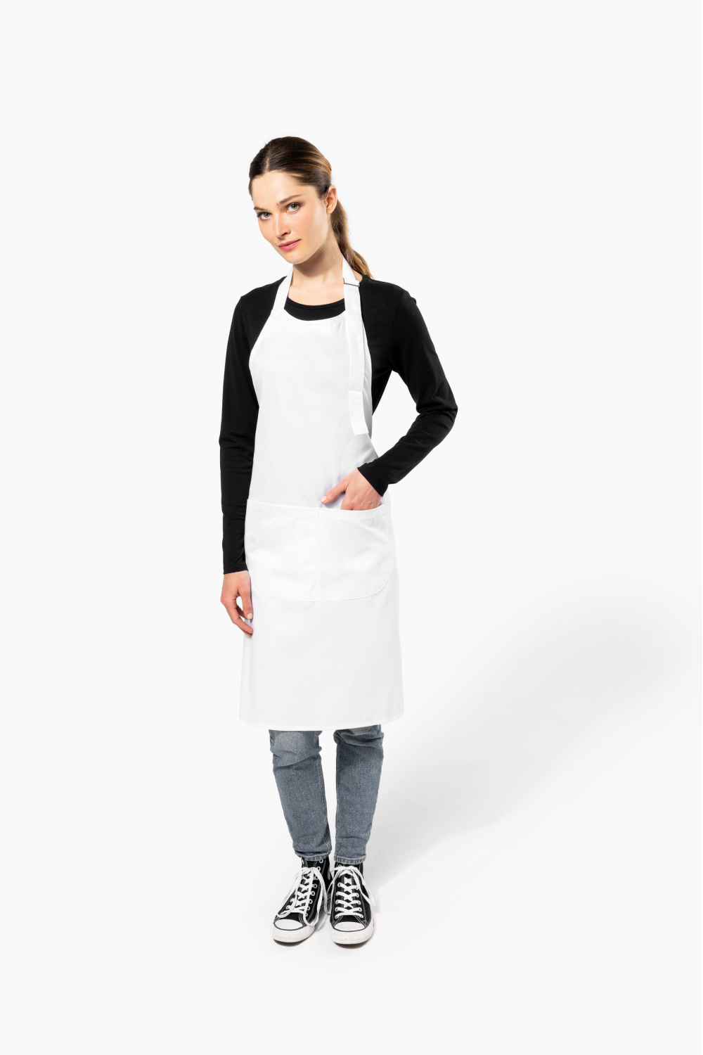 65% polyester / 35% coton. Lavage domestique 60°C. Lavage industriel 85°C conforme aux éxigences de la norme ISO15797. Boucle de réglage en métal au niveau du cou pour ajuster la longueur du tablier. Grande poche avant en deux compartiments. Dimensions : H 90 cm - L 76 cm. Poche : H 20 cm - L 31,5 cm. Certifié STANDARD 100 by OEKO-TEX® N° CQ 1007/8, IFTH.