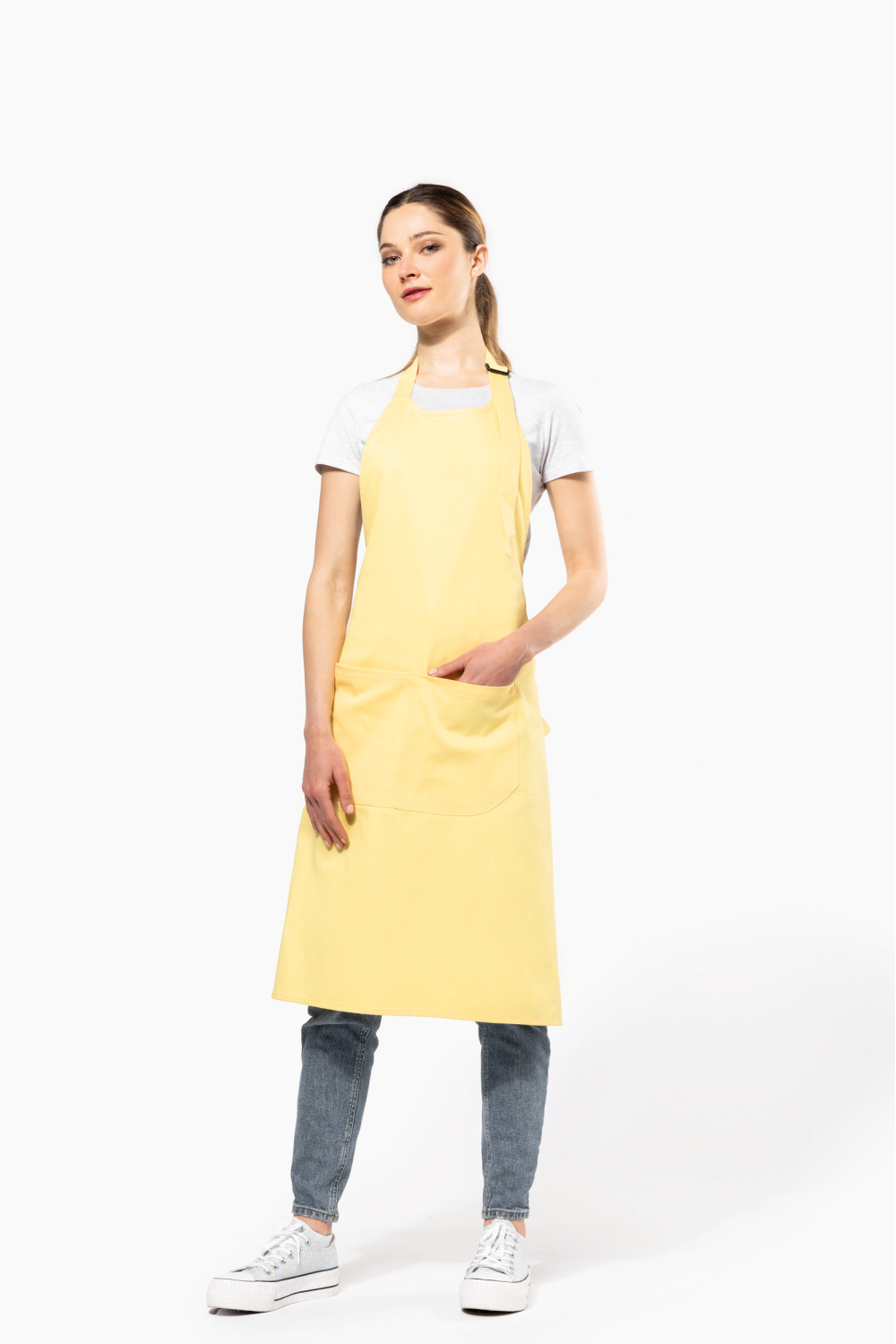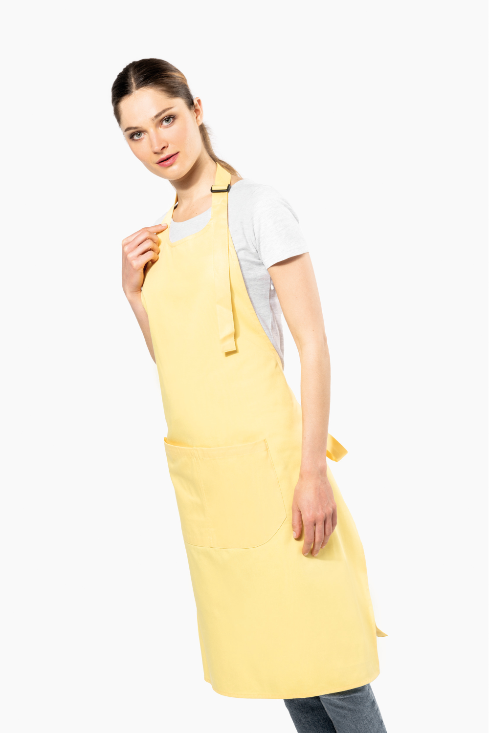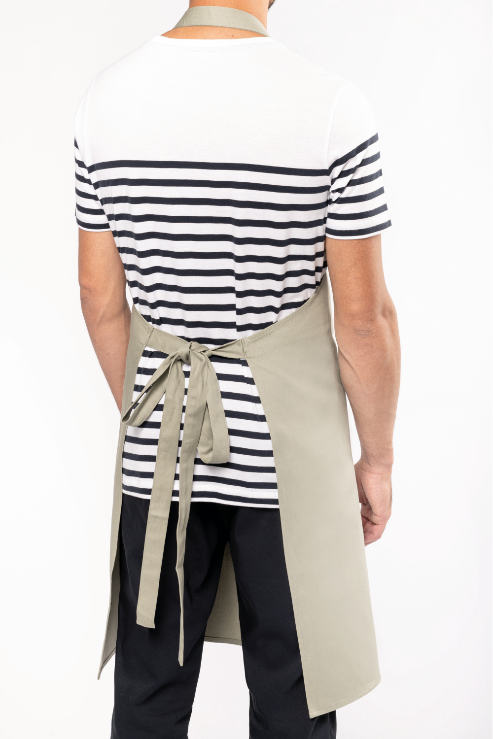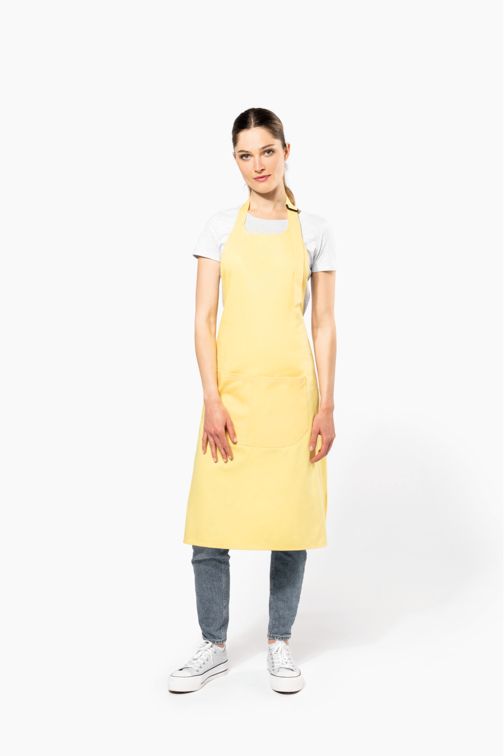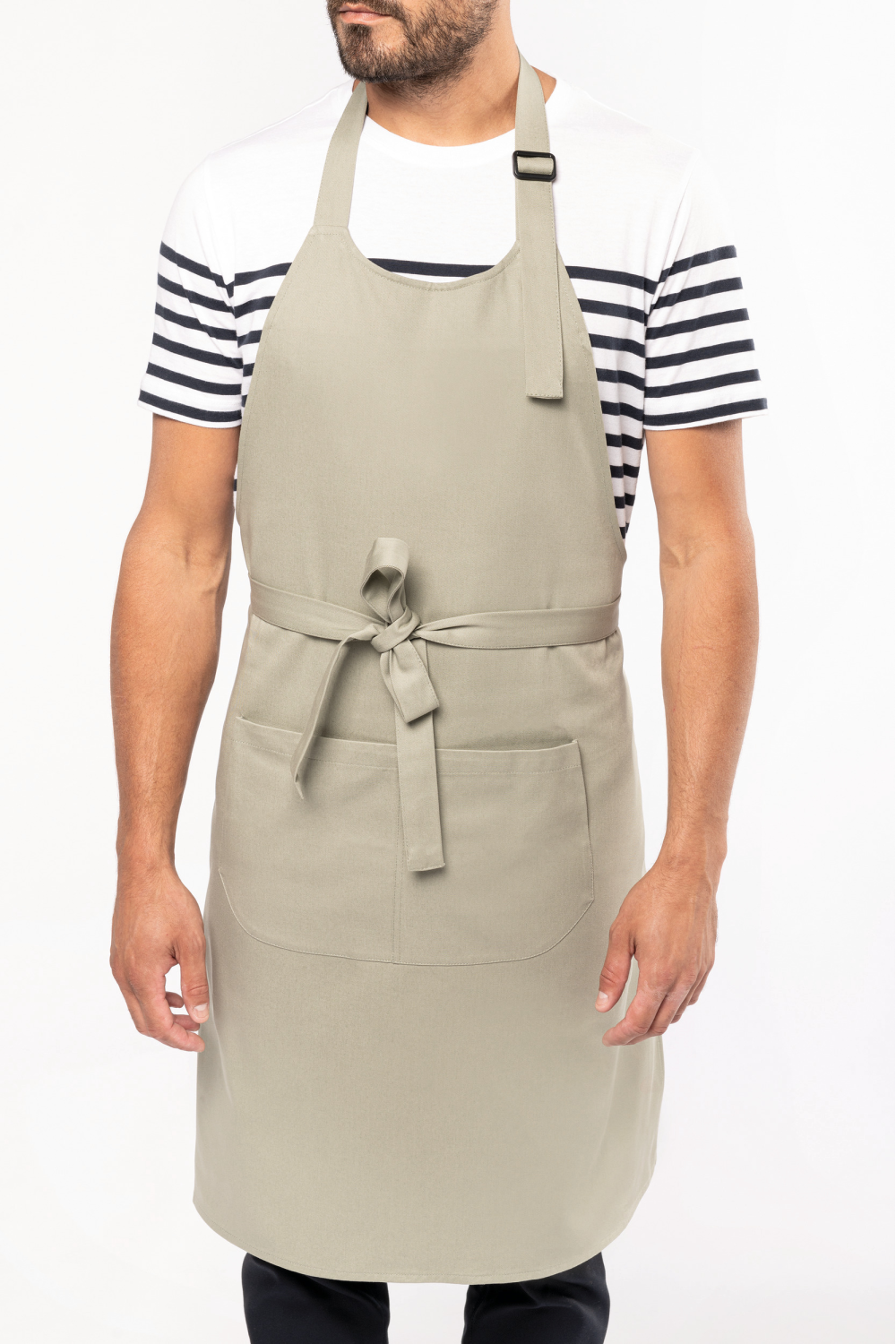 100% coton biologique. Lavage domestique 60°. Boucle de réglage en plastique recyclé au niveau du cou pour ajuster la longueur du tablier. Grande poche avant en deux compartiments. Dimensions : H 90 cm x L 76 cm. Poche : H 20 cm x L 31,5 cm. Certifié STANDARD 100 by OEKO-TEX® N° CQ 1007/8, IFTH.