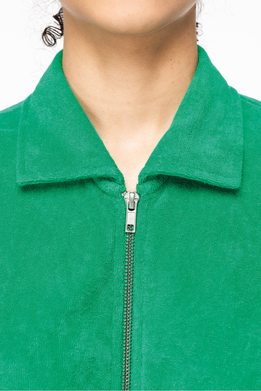 Fabriqué au Portugal. 80% coton biologique / 20% polyester recyclé post-consumer. Coton peigné. Matière éponge. Lavé aux enzymes. Coupe droite. Finition encolure avec bande de propreté en chevrons ton sur ton. Ourlet double aiguille en finition bas de manches et bas de vêtement. Ceinture plaquée avec cordon de serrage à la taille et œillets brodés pour le passage du cordon. Fermeture milieu devant avec zip en métal recyclé. Deux poches latérales à la taille avec surpiqûre à l'ouverture de poche. Demi-lune au dos.