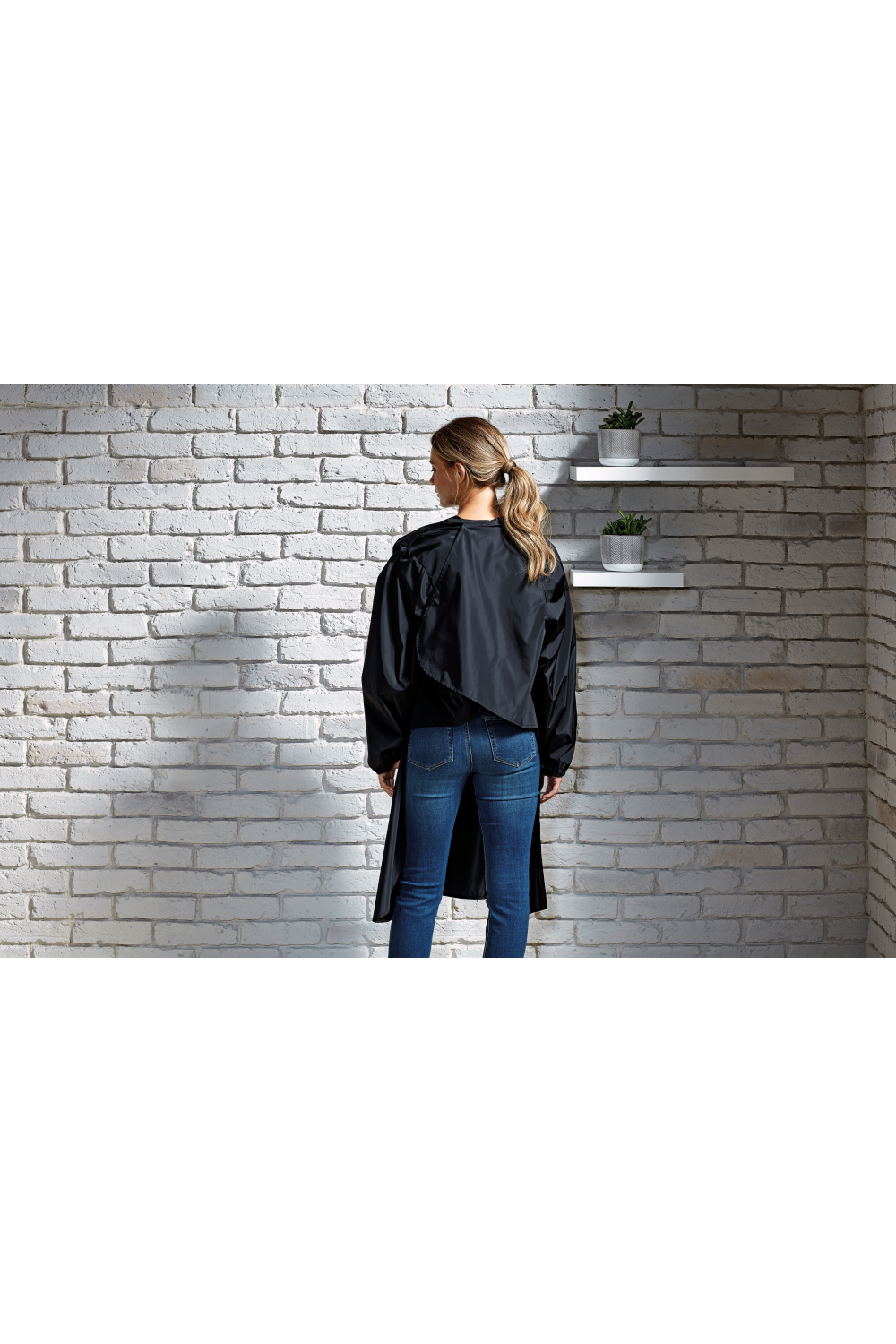 100% polyester avec un revêtement en polyuréthane. Elle s'attache autour de la nuque grâce à un système de fermeture réglable. Les manches longues sont terminées par une manchette élastique. Lavage domestique à 60°C.