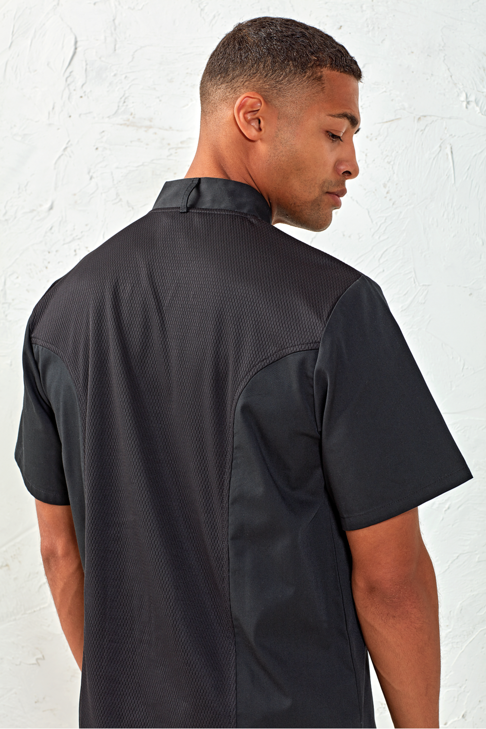 65% polyester / 35% coton. Fermeture enveloppante à dix boutons en tissus. Une double poche stylo sur la manche de gauche. Col mandarin. Le panneau central du dos est fabriqué à partir du tissu Coolchecker® qui offre une bonne gestion de l'humidité. Lavage domestique à 60°C.