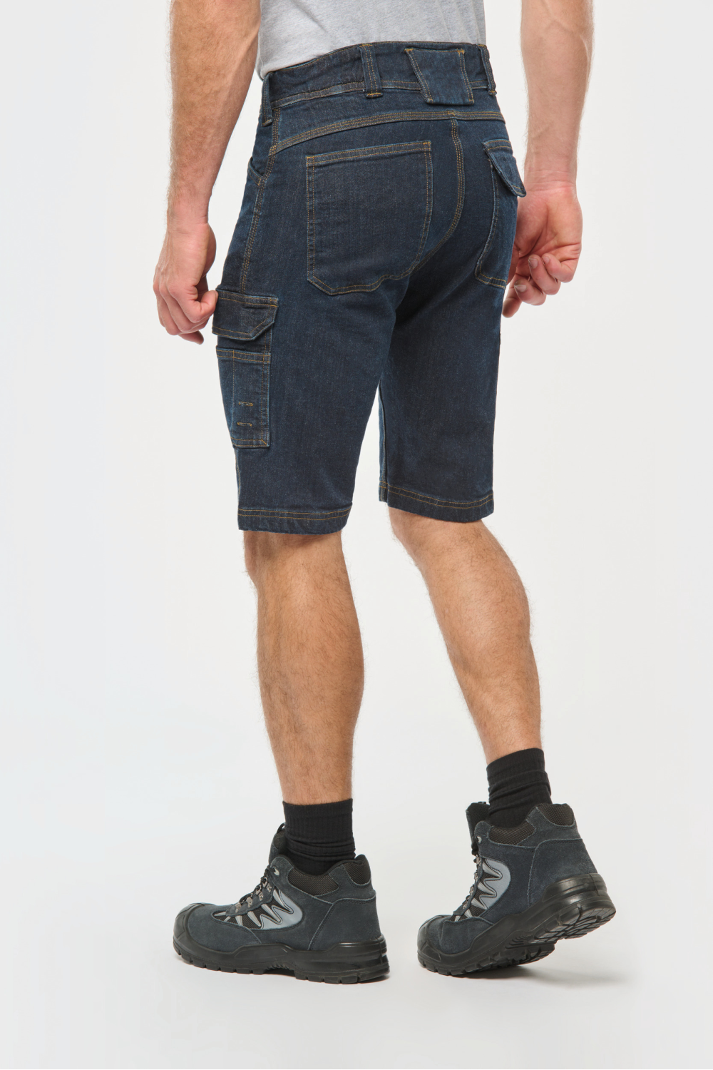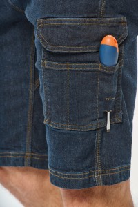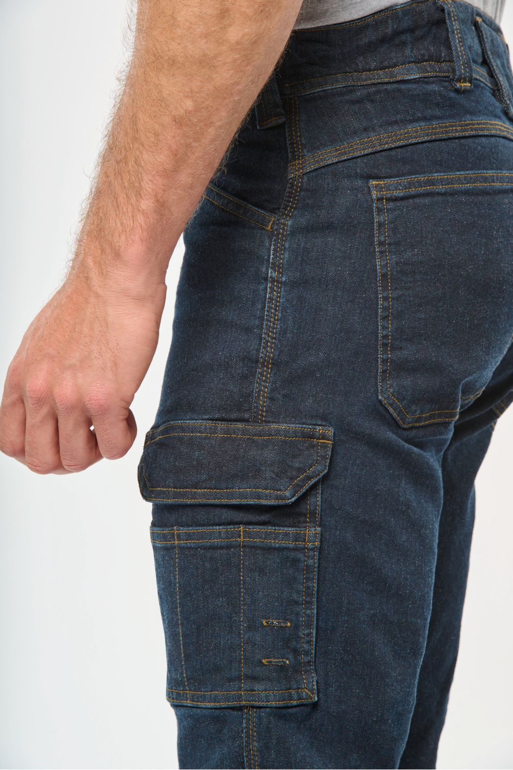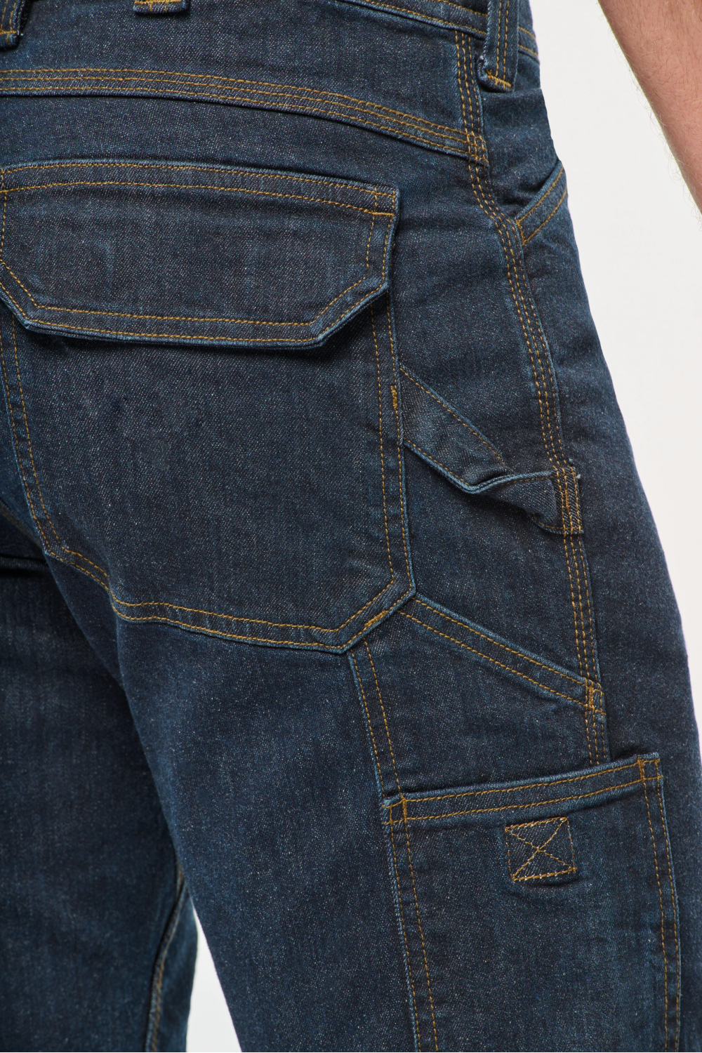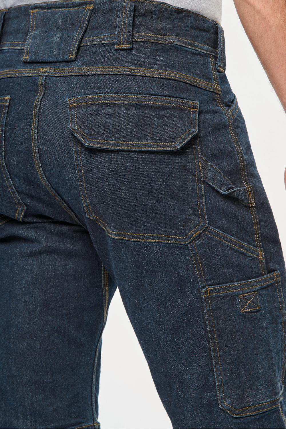 99% coton / 1% élasthanne. Toile denim. Coupe droite. Lavage industriel 60°C. Fermeture boutonnée avec cache-bouton et zip métal. Devant : 2 poches ouverture en biais. Côté gauche : poche à rabat avec couture renforcées et fermeture auto-agrippante. Sur-poche à 3 compartiments dont 1 avec passe stylo. Côté droit : passe-marteau, poche mètre et sur-poche avec fermeture auto-agrippante. Dos : 2 poches plaquées avec coutures renforcées dont une à rabat avec bande auto-agrippante. Ceinture arrondie dans le dos avec large bande élastique intérieure antiglisse pour un maintien optimal. Boucle orange intérieur milieu dos. Passants avec coutures renforcées et 1 anneau plastique à l'avant. Soufflet renforcé à l'entrejambe pour plus de résistance et une parfaite liberté de mouvement. Triple surpiqûres coutures côtés, intérieur jambe et fourche dos. Finition double aiguille au bas de jambe. Etiquette de marque détachable.