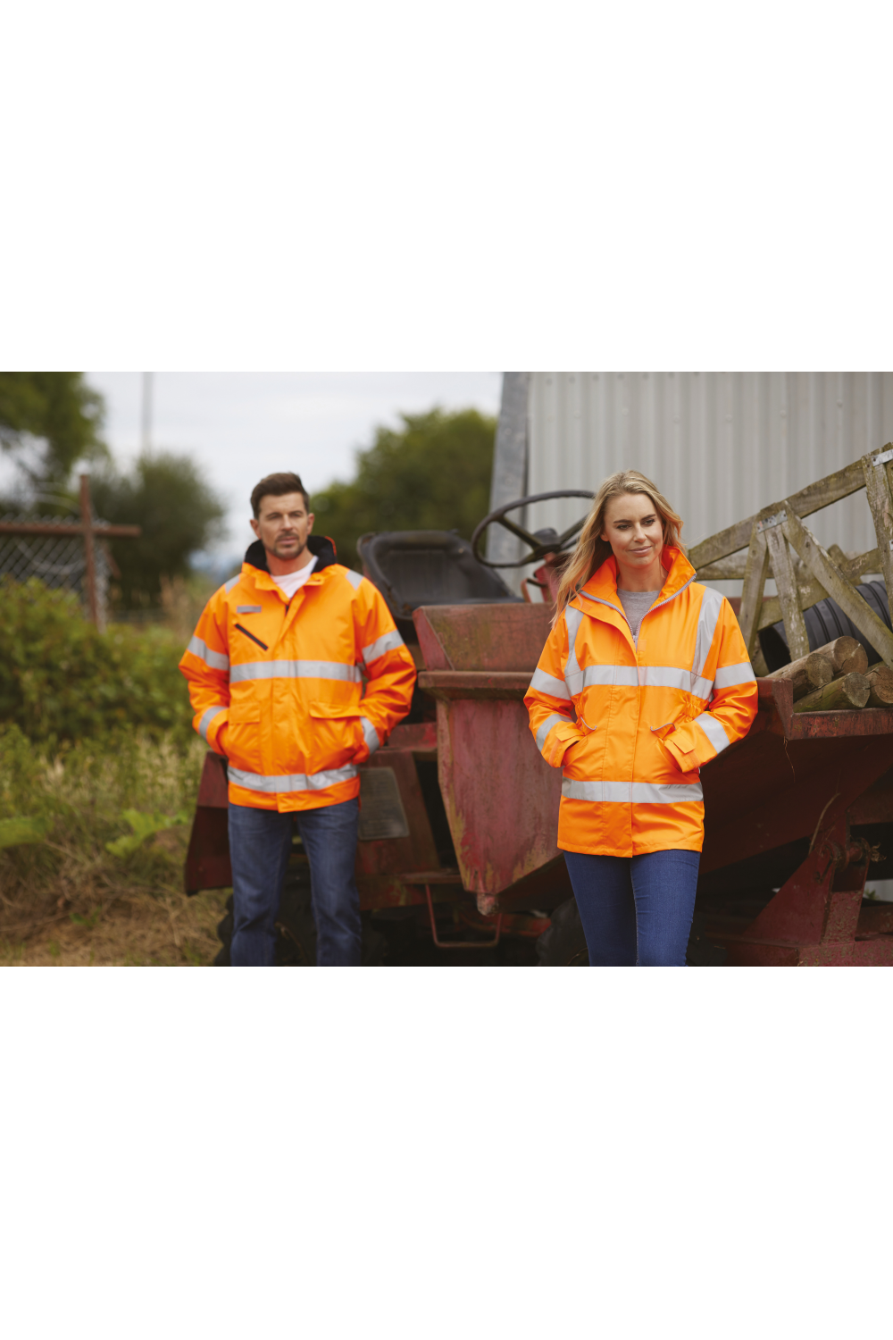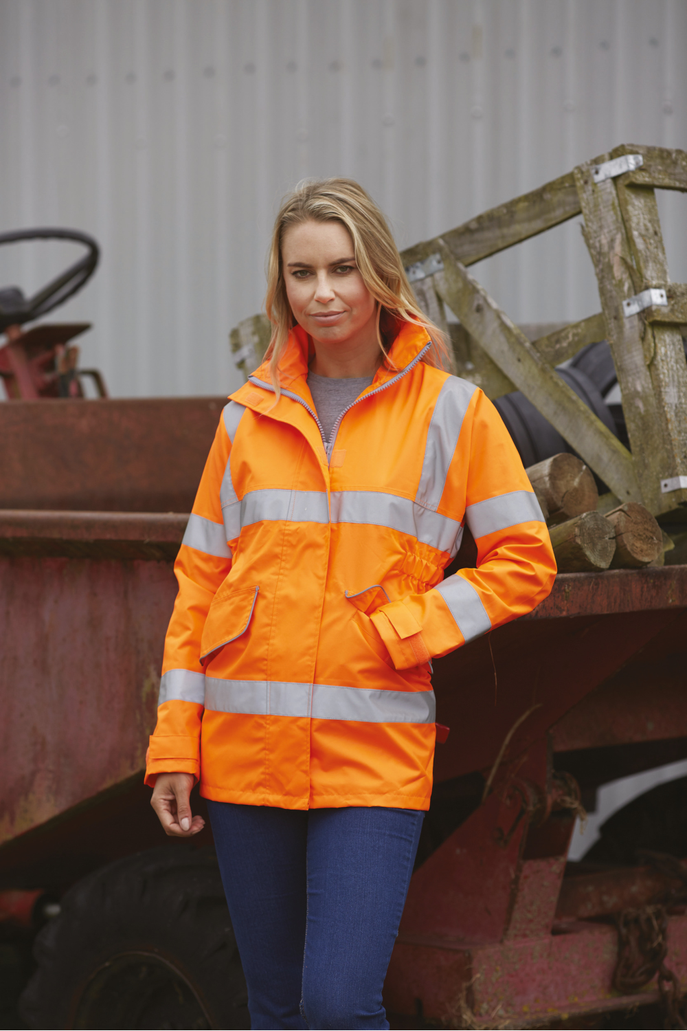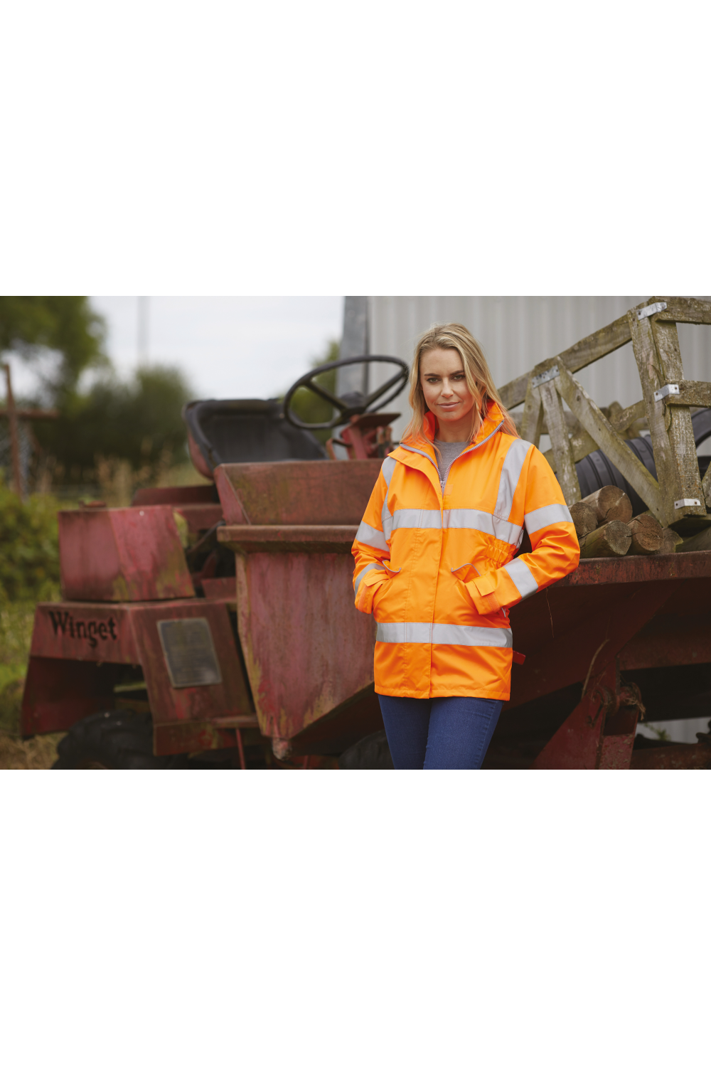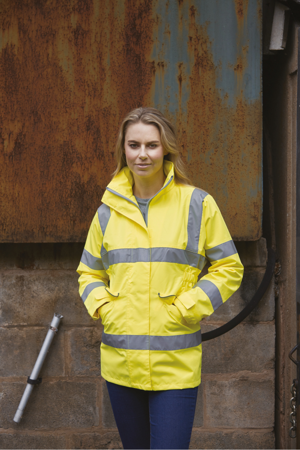 Veste 100% polyester combinant des fonctionnalités coupe-vent, imperméable et respirante. Doublure ton sur ton maille filet. Coutures étanches thermosoudées. Capuche intégrée au col avec fermeture auto-agrippante. Fermeture zippée à double curseur ultra-résistante avec patte auto-agrippante. Poches latérales sous patte auto-agrippante avec passepoil réfléchissant. Patte auto-agrippante aux poignets avec intérieur molletonné. Poche poitrine intérieure pour portable sur le côté droit. Coupe cintrée et taille semi-élastiquée pour un look plus élégant. Zip de personnalisation invisible sur le bas du vêtement (côté interne). Conforme aux normes EN ISO20471 de catégorie 3 et EN 343:2003 + A1:2007 de catégorie 3,3.