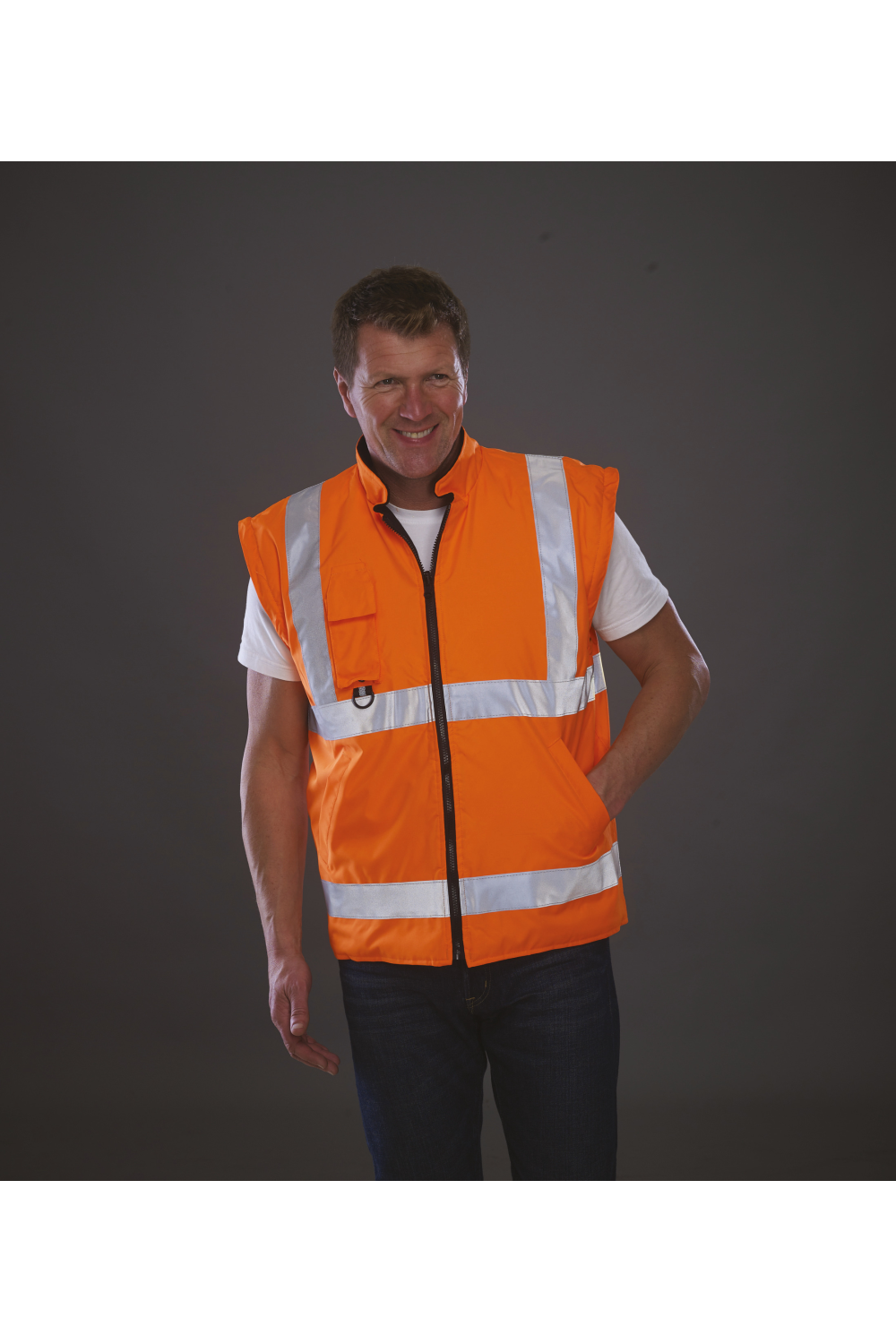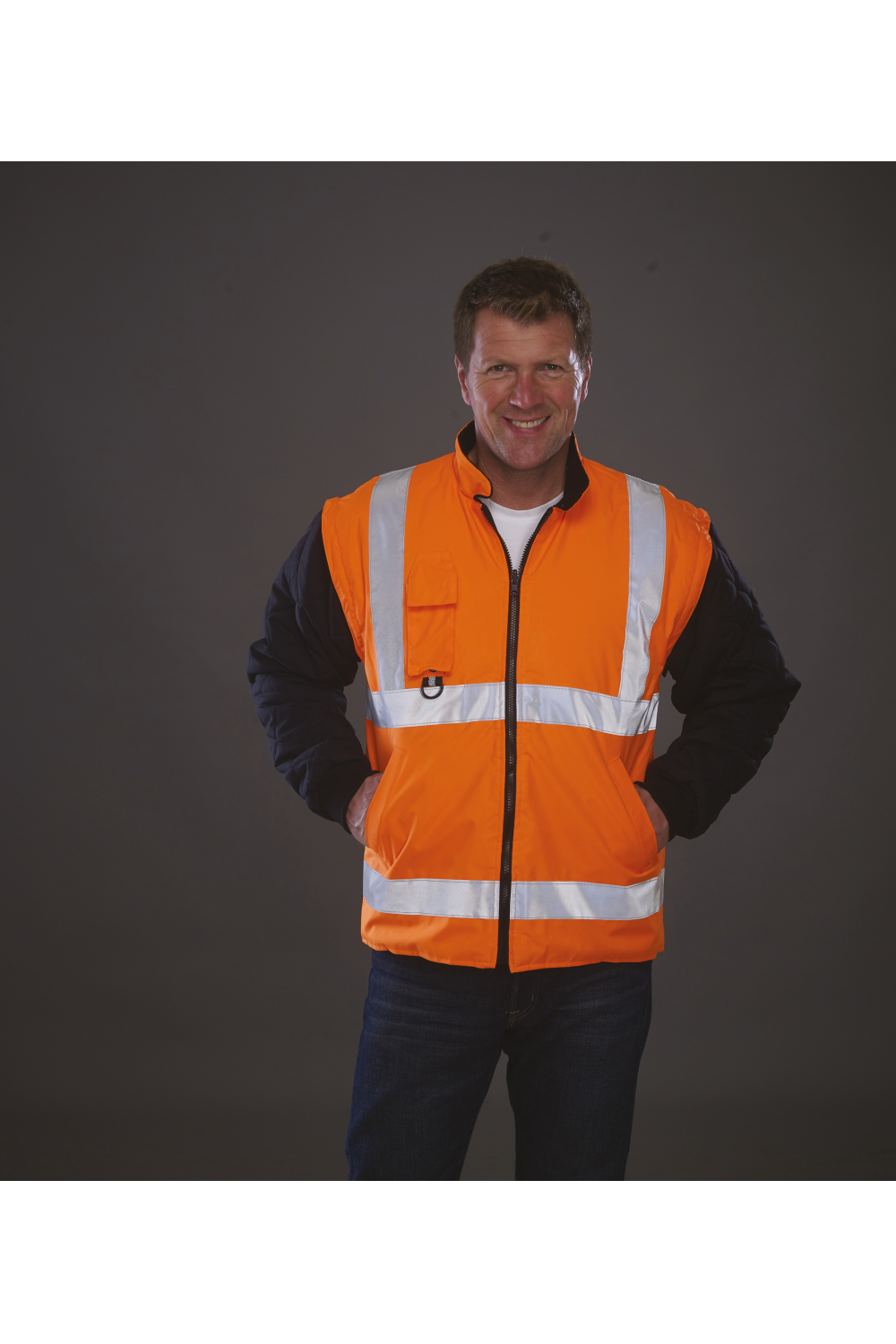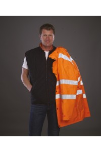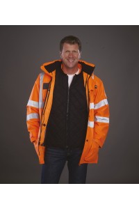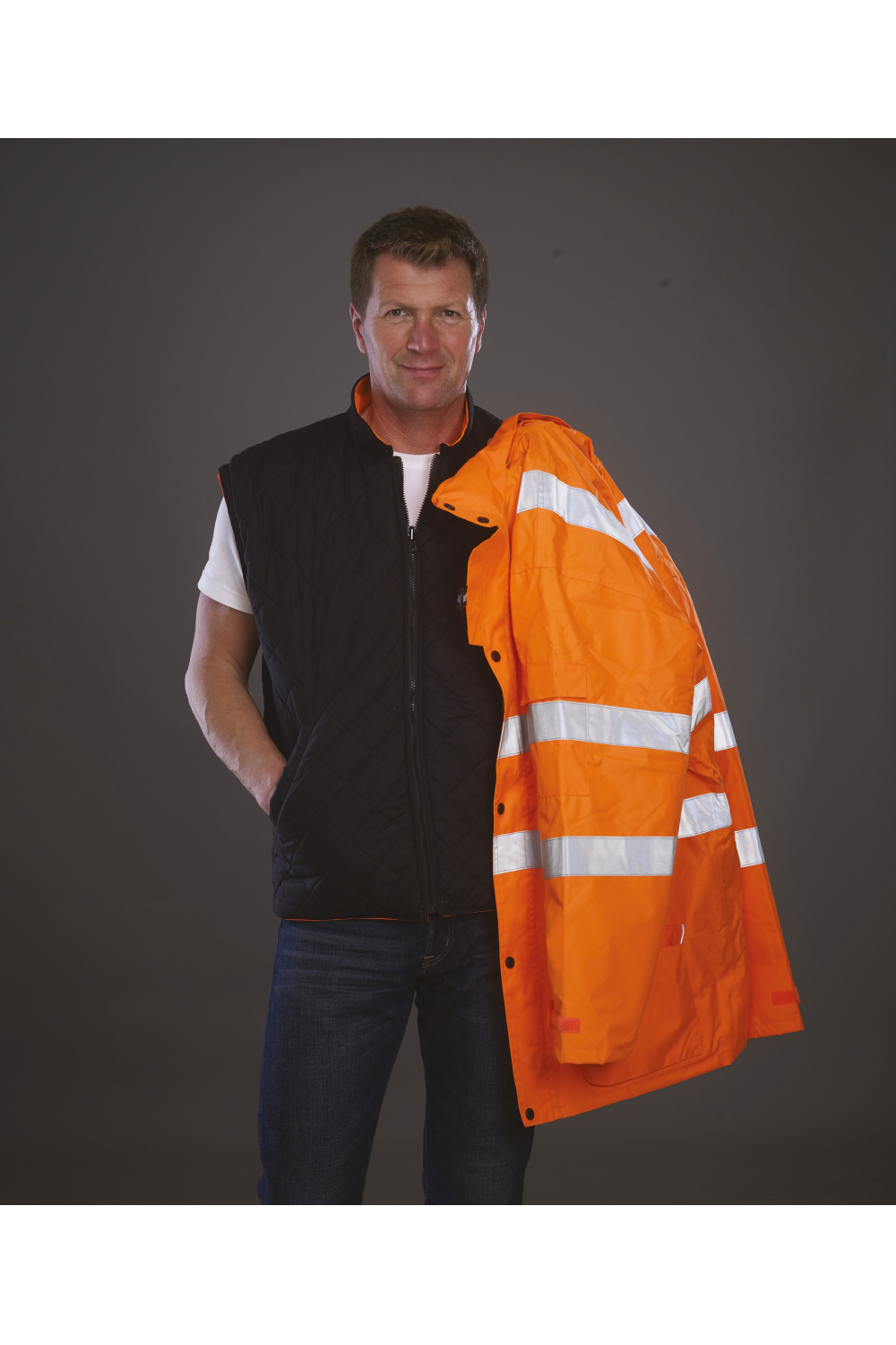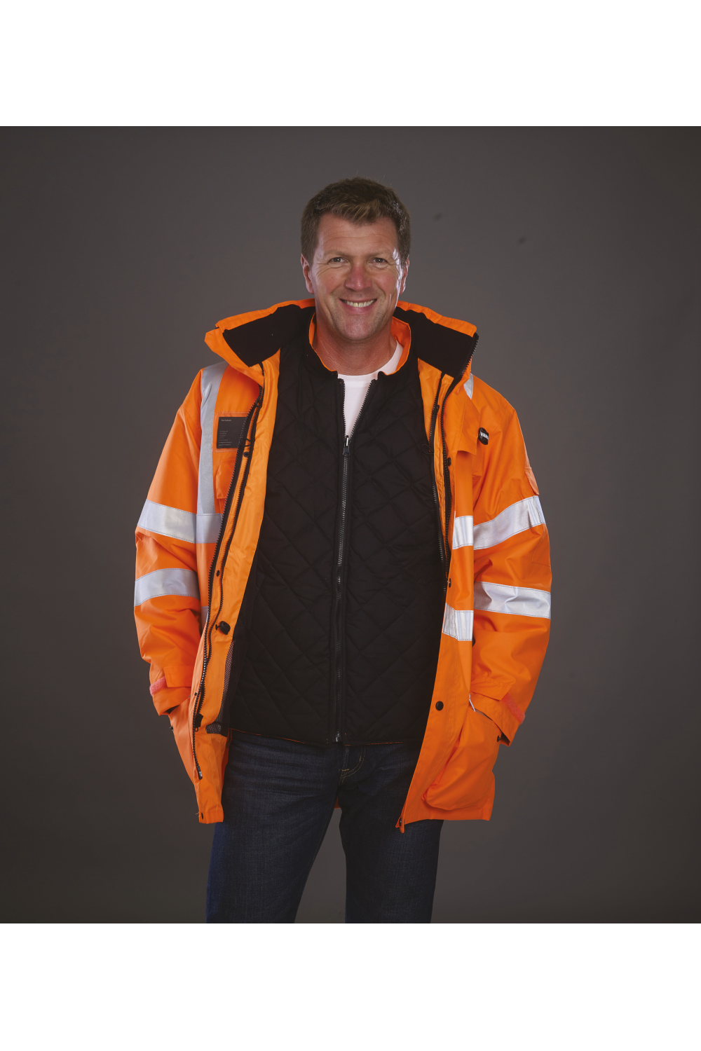 Veste extérieure : polyester Oxford avec revêtement PU 300D. Doublure en maille. Imperméable et respirant. Coutures entièrement cousues et collées pour une étanchéité parfaite. Deux poches réchauffe-mains externes. Capuche détachable dissimulée. Poches pour téléphone portable et papiers d'identité sur la poitrine. Conforme à la norme EN ISO20471:2013 catégorie 3. Egalement conforme à la norme relative aux 'Vêtements de Haute Visibilité' des chemins de fer UK GO/RT 3279 Issue 8:2013 (orange uniquement). Veste intérieure : rattachée à la parka par zip. Manches amovibles. Matelassée. Haute visibilité. Réversible Black. Deux poches de chaque côté.