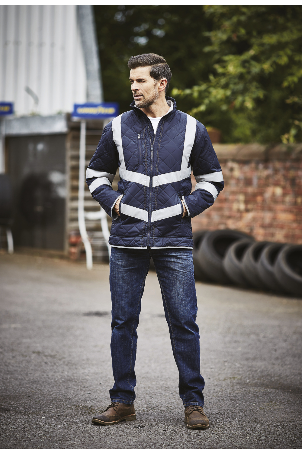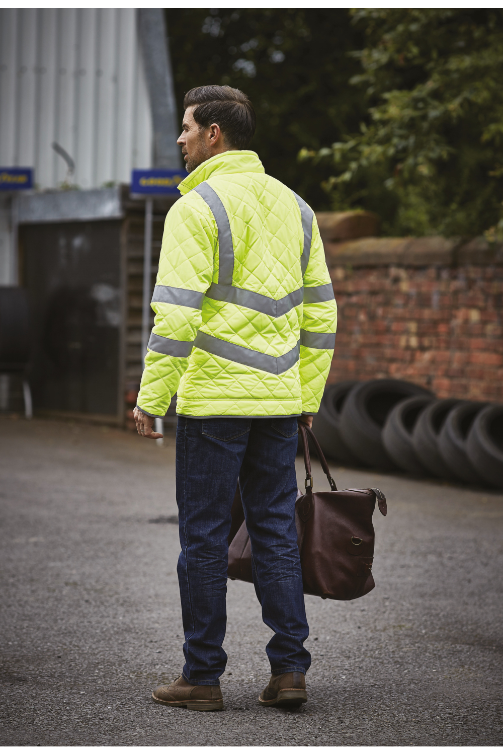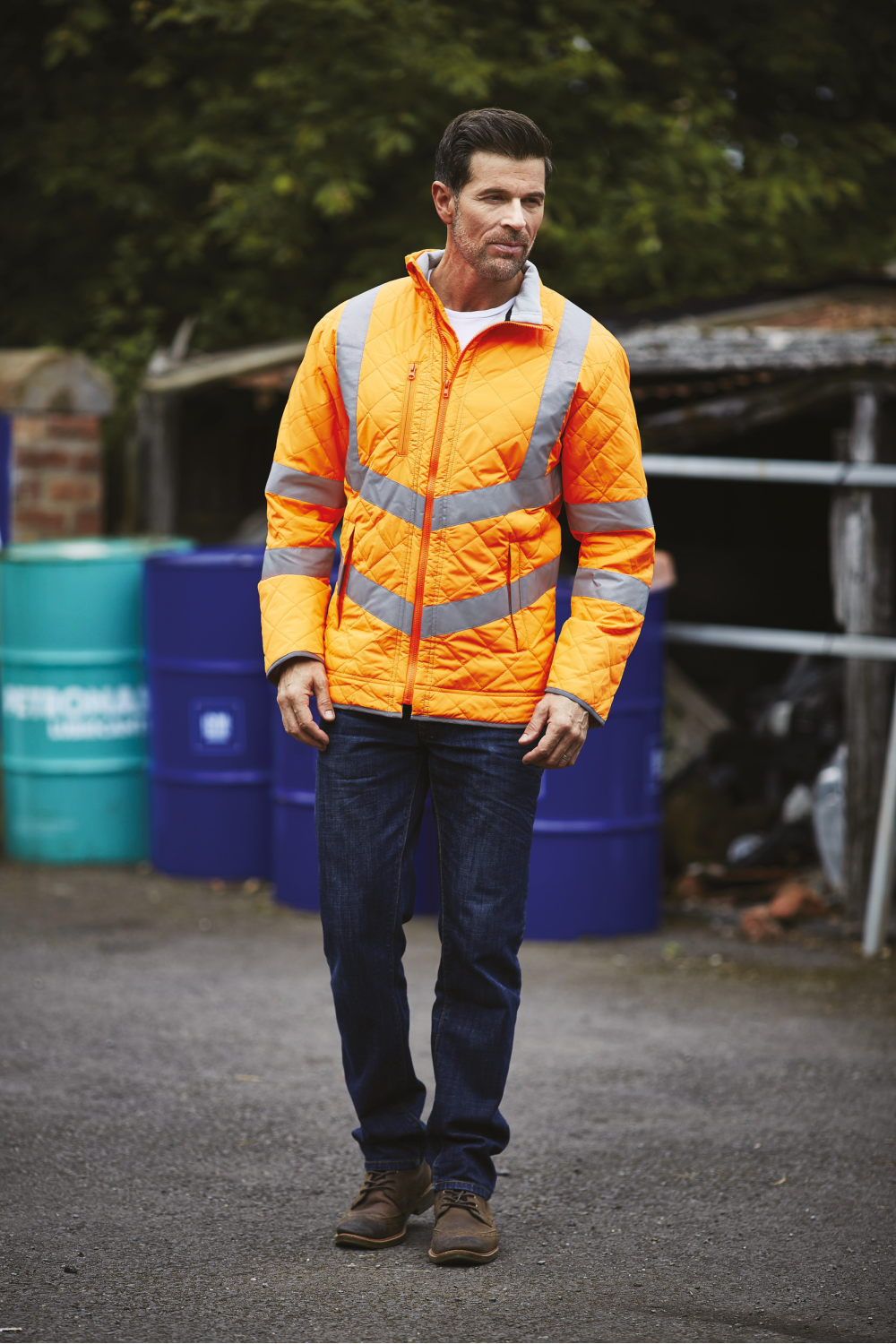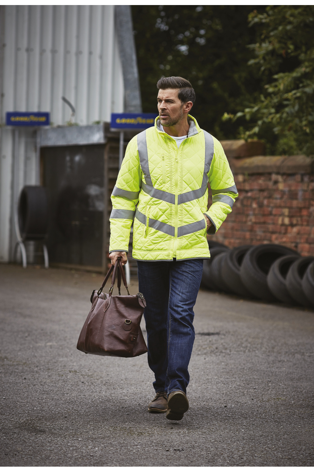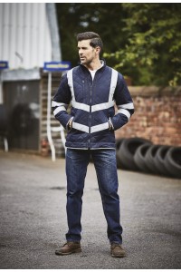 100% polyester extérieur déperlant avec doublure polaire et matelassage 100% polyester. 2 bandes réfléchissantes (5 cm de largeur) en forme de V sur le corps et les bras pour une meilleure visibilité. Col montant avec protection menton intégrée. Poche poitrine zippée. 2 poches chauffe-mains latérales zippées. 1 poche plaquée dans la doublure fixe en polaire. Passepoils réfléchissants bas de manche et de vêtement. Zip de personnalisation invisible sur le bas du vêtement (côté interne). Conforme à la norme EN ISO 20471:2013 de catégorie 3 (uniquement les coloris Hi-Vis Yellow et Hi-Vis Orange) et à la norme relative aux "Vêtements de Haute Visibilité" des chemins de fer UK GO/RT 3279 Issue 8:2013 (Hi-Vis Orange uniquement ).